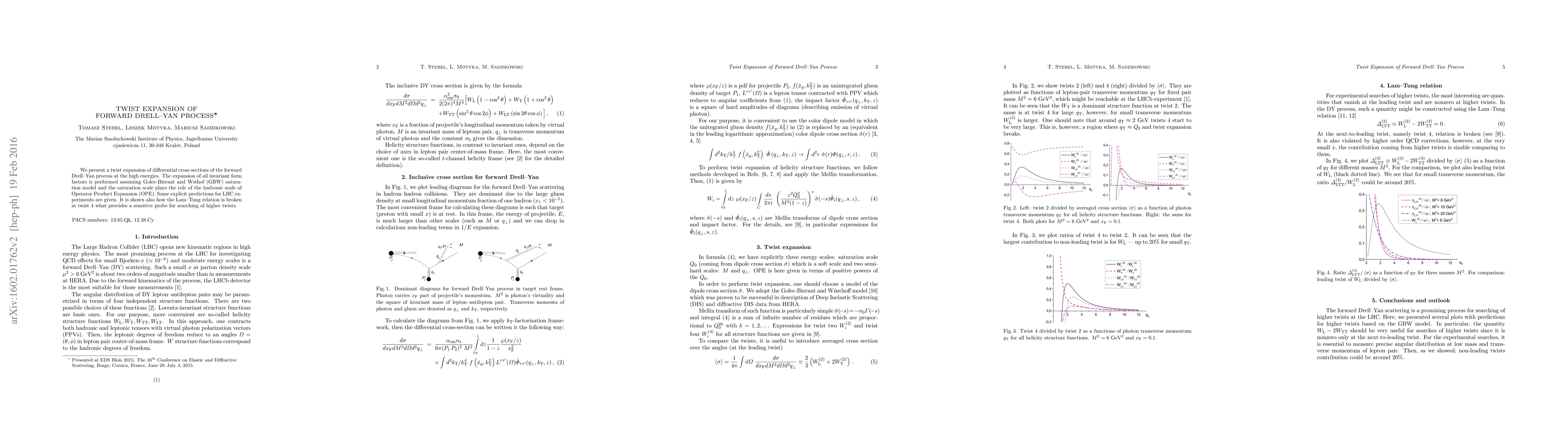 This paper presents a twist expansion of the forward Drell-Yan process differential cross-sections at high energies, utilizing the GBW saturation model. It predicts outcomes for LHC experiments and reveals the breaking of the Lam-Tung relation at twist 4, offering a probe for higher twists.