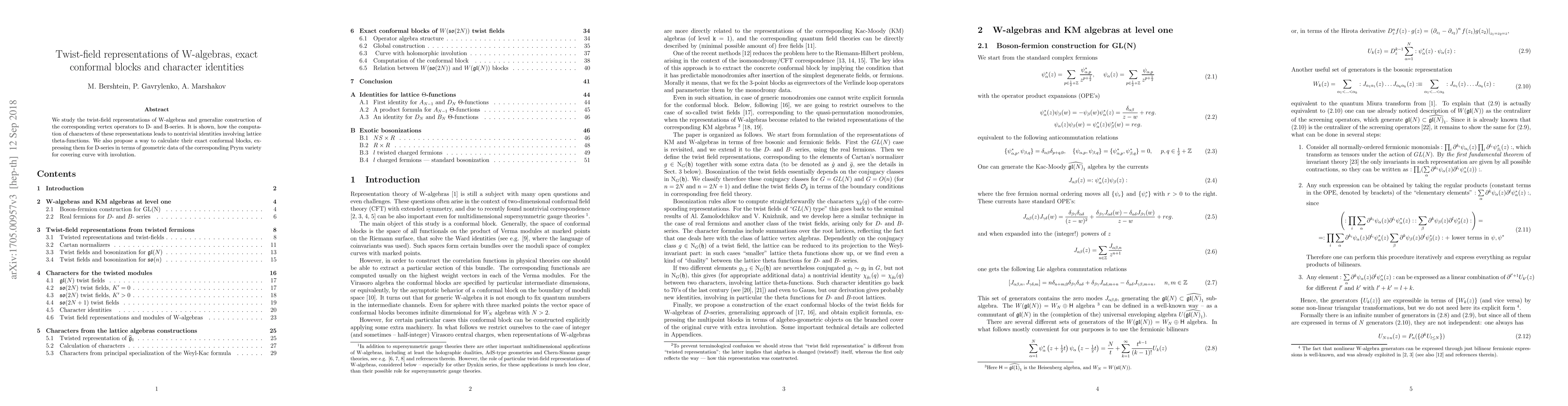 This paper explores twist-field representations of W-algebras, extending the construction of vertex operators to D- and B-series, and derives nontrivial identities involving lattice theta-functions from character computations. It also proposes a method to calculate exact conformal blocks for D-series using geometric data from Prym varieties of covering curves with involution.
