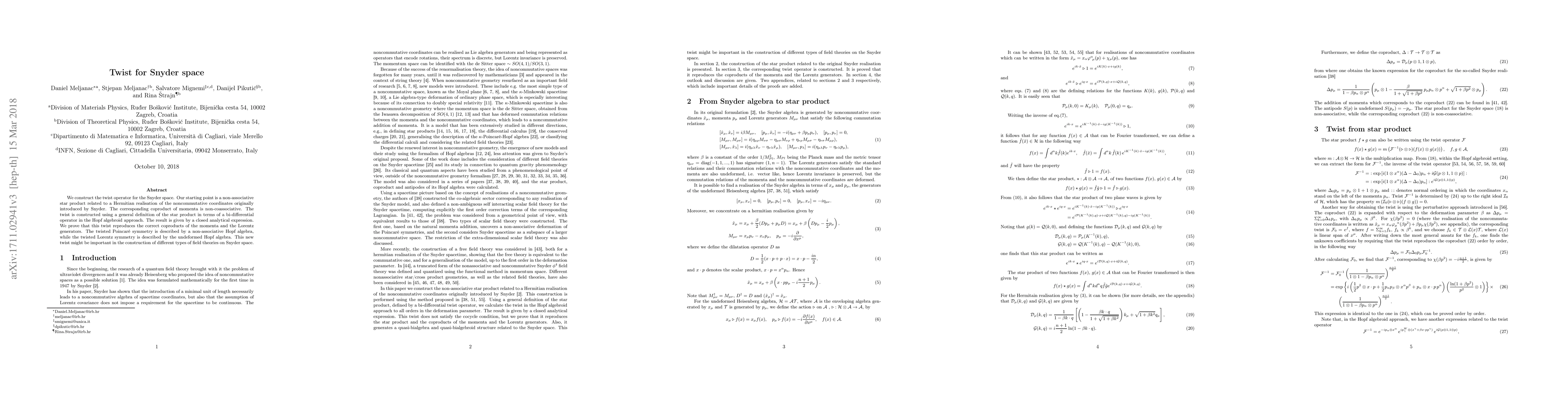 This paper constructs a twist operator for Snyder space using a non-associative star product and proves it reproduces the correct coproducts of momenta and Lorentz generators. The twist leads to a non-associative Hopf algebra for the Poincaré symmetry and an undeformed Hopf algebra for the Lorentz symmetry.