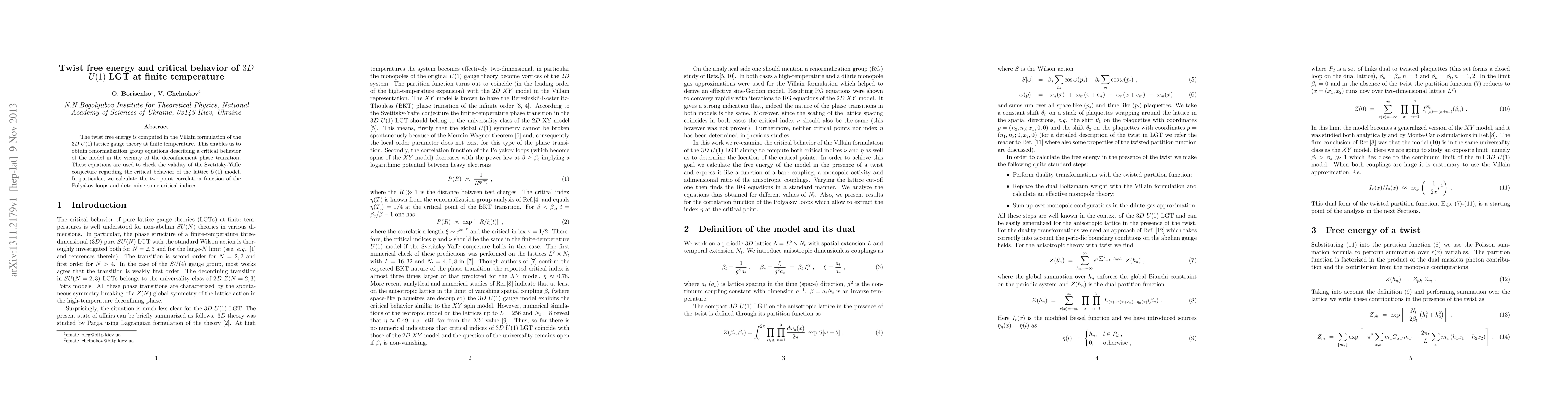 This paper computes the twist free energy in 3D U(1) lattice gauge theory at finite temperature, deriving renormalization group equations to analyze critical behavior near the deconfinement phase transition. It validates the Svetitsky-Yaffe conjecture by calculating the two-point correlation function of Polyakov loops and determining critical indices.