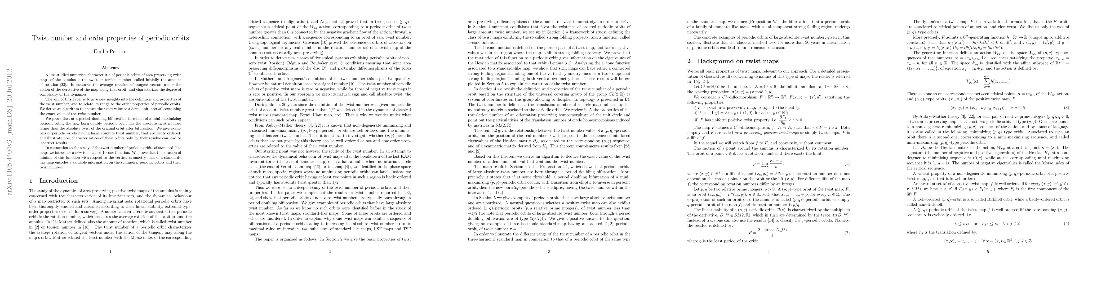 A less studied numerical characteristic of periodic orbits of area preserving twist maps of the annulus is the twist or torsion number, called initially the amount of rotation. It measures the average rotation of tangent vectors under the action of the derivative of the map along that orbit, and characterizes the degree of complexity of the dynamics. The aim of this paper is to give new insights into the definition and properties of the twist number, and to relate its range to the order properties of periodic orbits. We derive an algorithm to deduce the exact value or a demi--unit interval containing the exact value of the twist number. We prove that at a period-doubling bifurcation threshold of a mini-maximizing periodic orbit, the new born doubly periodic orbit has the absolute twist number larger than the absolute twist of the original orbit after bifurcation. We give examples of periodic orbits having large absolute twist number, that are badly ordered, and illustrate how characterization of these orbits only by their residue can lead to incorrect results. In connection to the study of the twist number of periodic orbits of standard--like maps we introduce a new tool, called 1-cone function. We prove that the location of minima of this function with respect to the vertical symmetry lines of a standard-like map encodes a valuable information on the symmetric periodic orbits and their twist number.