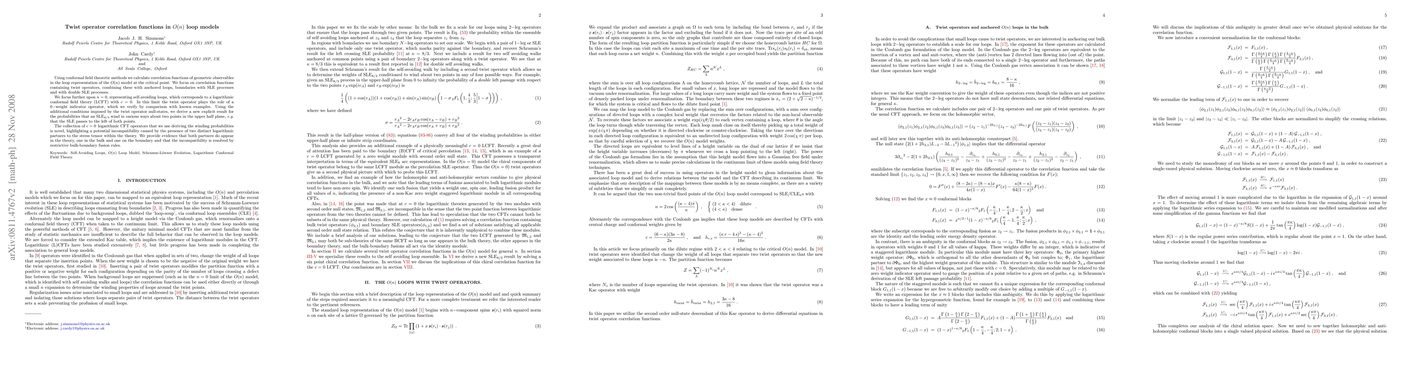 Using conformal field theoretic methods we calculate correlation functions of geometric observables in the loop representation of the O(n) model at the critical point. We focus on correlation functions containing twist operators, combining these with anchored loops, boundaries with SLE processes and with double SLE processes. We focus further upon n=0, representing self-avoiding loops, which corresponds to a logarithmic conformal field theory (LCFT) with c=0. In this limit the twist operator plays the role of a zero weight indicator operator, which we verify by comparison with known examples. Using the additional conditions imposed by the twist operator null-states, we derive a new explicit result for the probabilities that an SLE_{8/3} wind in various ways about two points in the upper half plane, e.g. that the SLE passes to the left of both points. The collection of c=0 logarithmic CFT operators that we use deriving the winding probabilities is novel, highlighting a potential incompatibility caused by the presence of two distinct logarithmic partners to the stress tensor within the theory. We provide evidence that both partners do appear in the theory, one in the bulk and one on the boundary and that the incompatibility is resolved by restrictive bulk-boundary fusion rules.