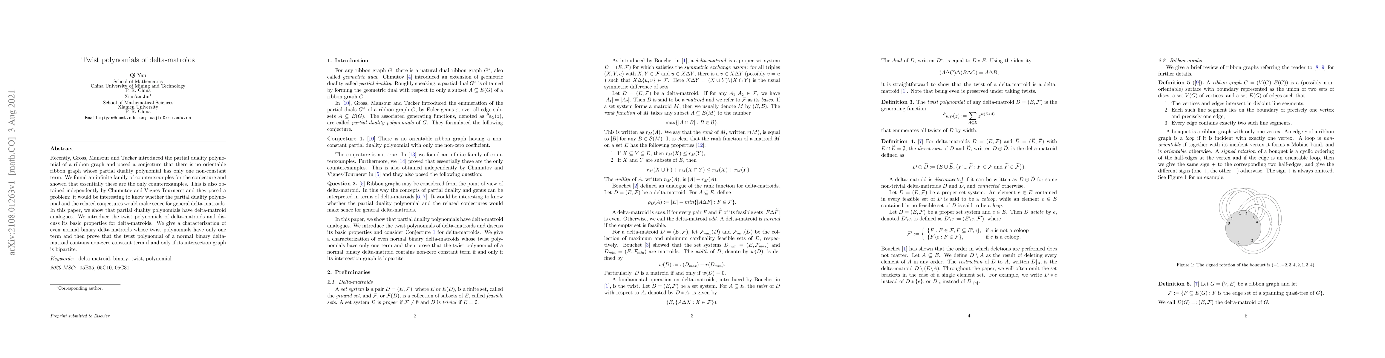 Recently, Gross, Mansour and Tucker introduced the partial duality polynomial of a ribbon graph and posed a conjecture that there is no orientable ribbon graph whose partial duality polynomial has only one non-constant term. We found an infinite family of counterexamples for the conjecture and showed that essentially these are the only counterexamples. This is also obtained independently by Chumutov and Vignes-Tourneret and they posed a problem: it would be interesting to know whether the partial duality polynomial and the related conjectures would make sence for general delta-matroids. In this paper, we show that partial duality polynomials have delta-matroid analogues. We introduce the twist polynomials of delta-matroids and discuss its basic properties for delta-matroids. We give a characterization of even normal binary delta-matroids whose twist polynomials have only one term and then prove that the twist polynomial of a normal binary delta-matroid contains non-zero constant term if and only if its intersection graph is bipartite.