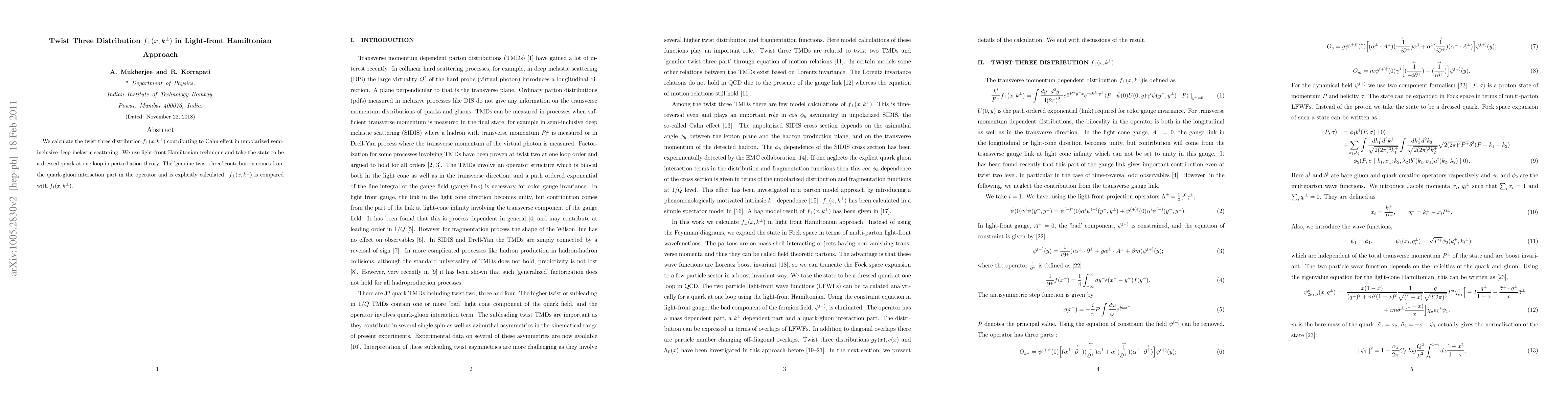 The paper presents a detailed calculation of the twist three distribution f_\perp(x,k^\perp) using light-front Hamiltonian formalism, explicitly calculating the quark-gluon interaction part.