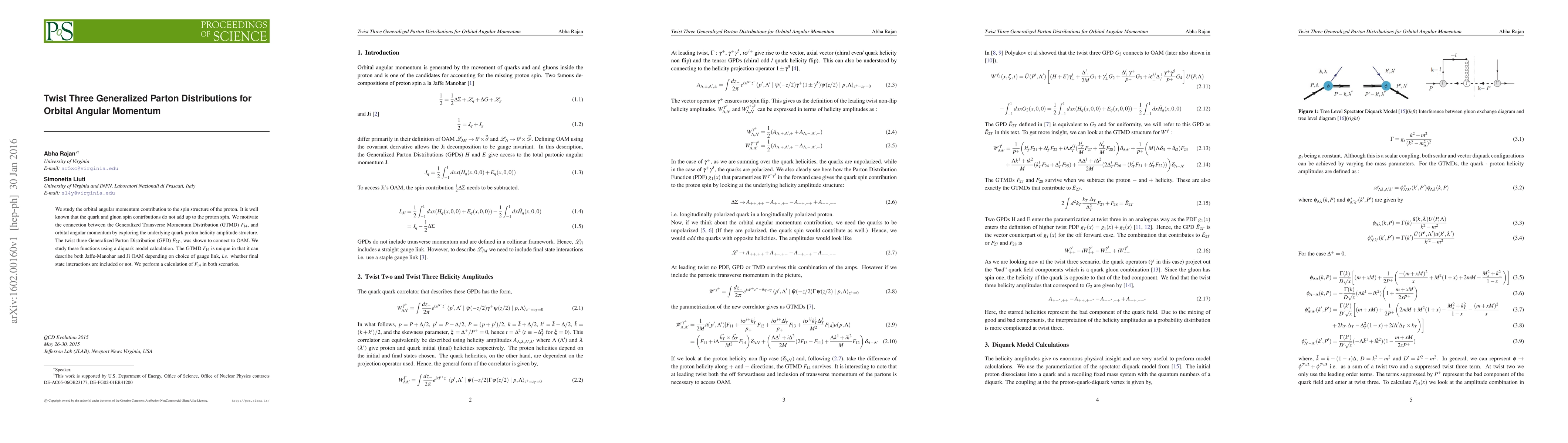 We study the orbital angular momentum contribution to the spin structure of the proton. It is well known that the quark and gluon spin contributions do not add up to the proton spin. We motivate the connection between the Generalized Transverse Momentum Distribution (GTMD) $F_{14}$, and orbital angular momentum by exploring the underlying quark proton helicity amplitude structure. The twist three Generalized Parton Distribution (GPD) $\tilde{E}_{2T}$, was shown to connect to OAM. We study these functions using a diquark model calculation. The GTMD $F_{14}$ is unique in that it can describe both Jaffe-Manohar and Ji OAM depending on choice of gauge link, i.e. whether final state interactions are included or not. We perform a calculation of $F_{14}$ in both scenarios.