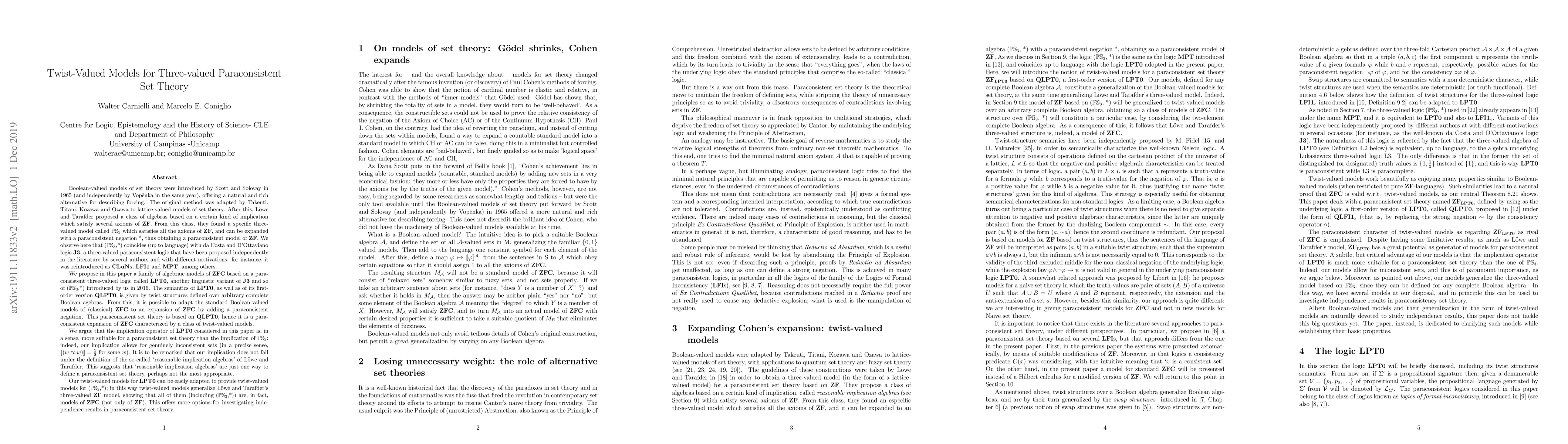 This paper introduces twist-valued models for a three-valued paraconsistent set theory, extending Boolean-valued models to accommodate a paraconsistent negation. It argues that the implication operator in LPT0, a linguistic variant of J3, is more suitable than that in PS3 for paraconsistent set theory.