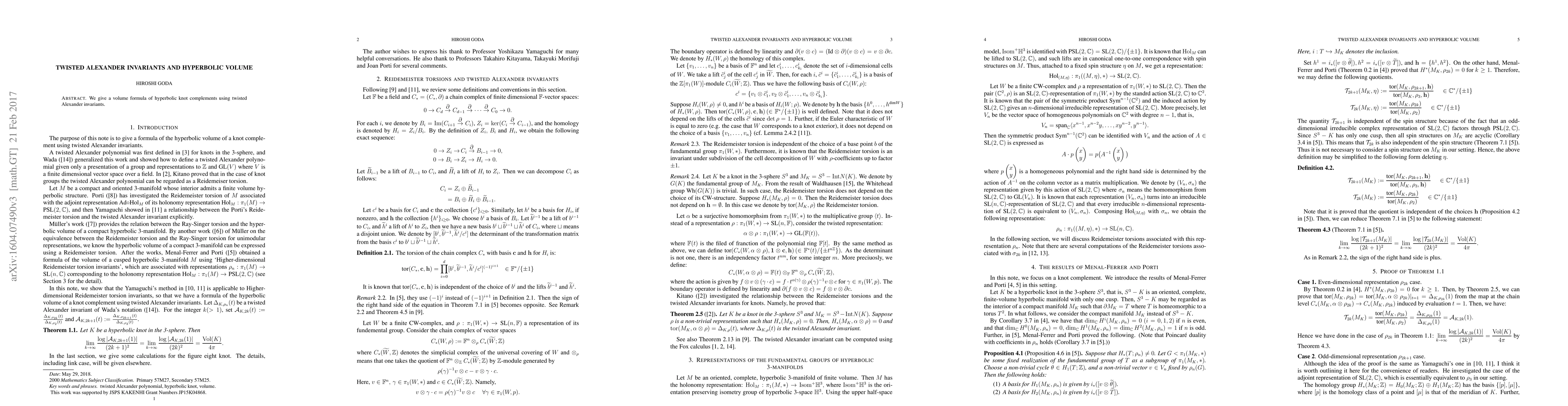 The paper derives a volume formula for hyperbolic knot complements using twisted Alexander invariants and Reidemeister torsion, employing homology theory and representations of fundamental groups.