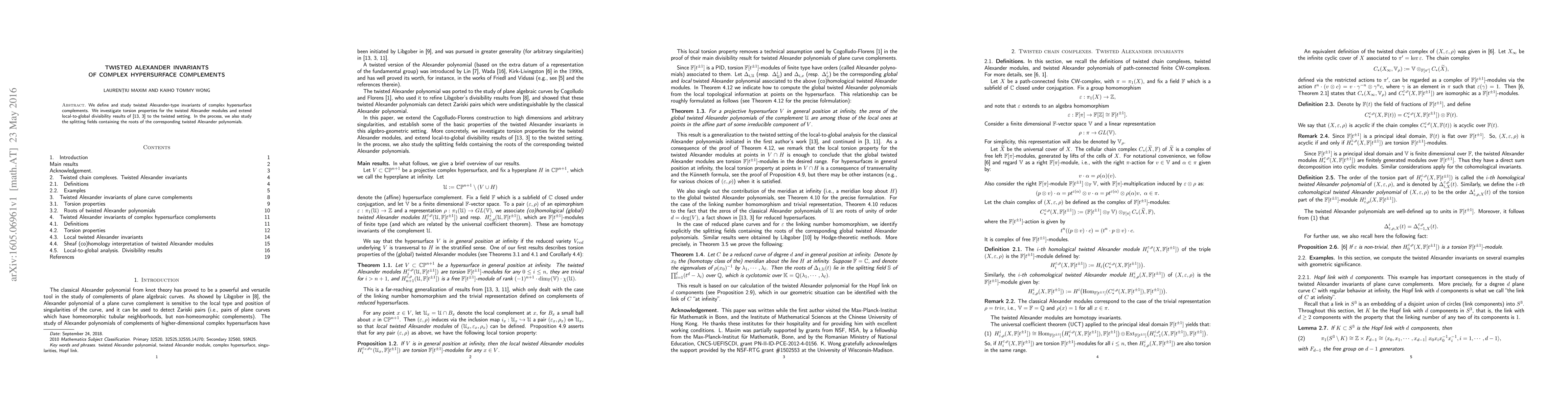 Summary: This paper introduces twisted Alexander invariants for complex hypersurface complements, examines their torsion properties, and extends classical divisibility results to this context, while also exploring the splitting fields of the twisted Alexander polynomials.