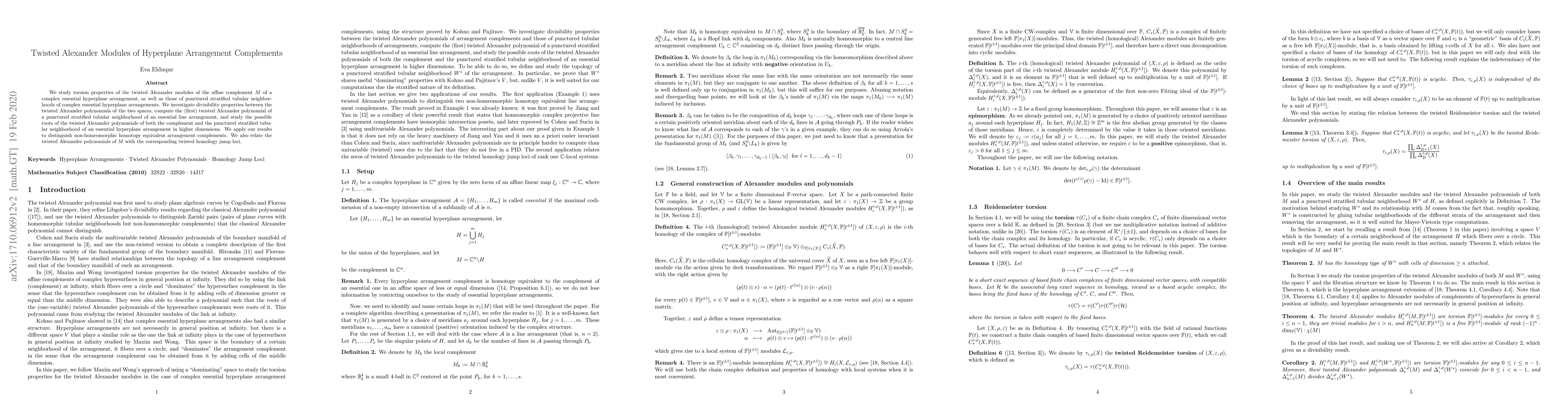 The research introduced a new approach to studying torsion properties of twisted Alexander modules, providing a novel method for distinguishing non-homeomorphic arrangement complements.