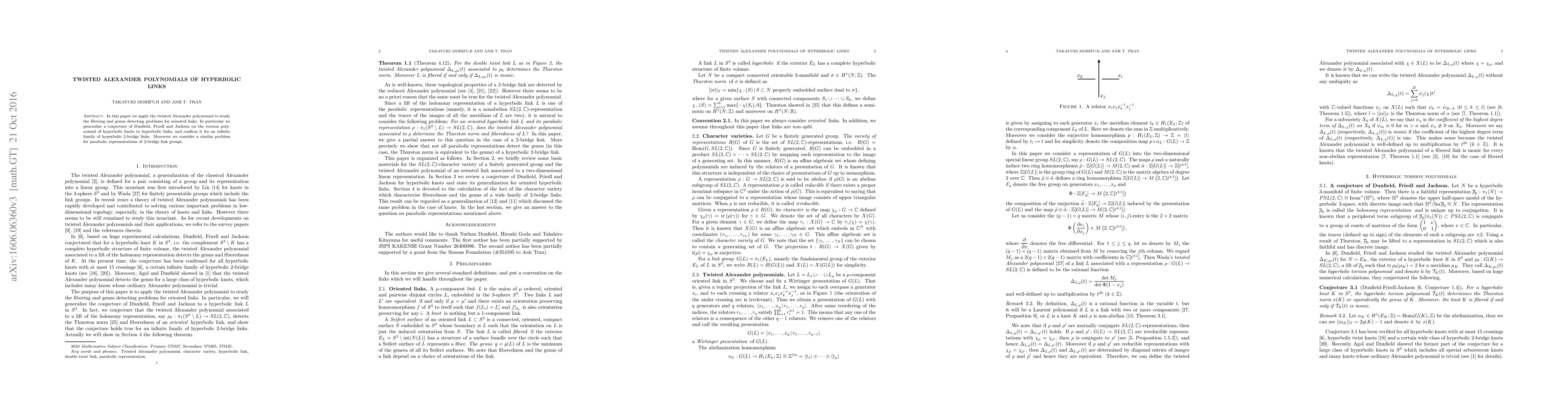 This paper uses twisted Alexander polynomials to explore fibering and genus detection in hyperbolic links, extending a conjecture about torsion polynomials from hyperbolic knots to links and verifying it for hyperbolic 2-bridge links. It also investigates parabolic representations of 2-bridge link groups.