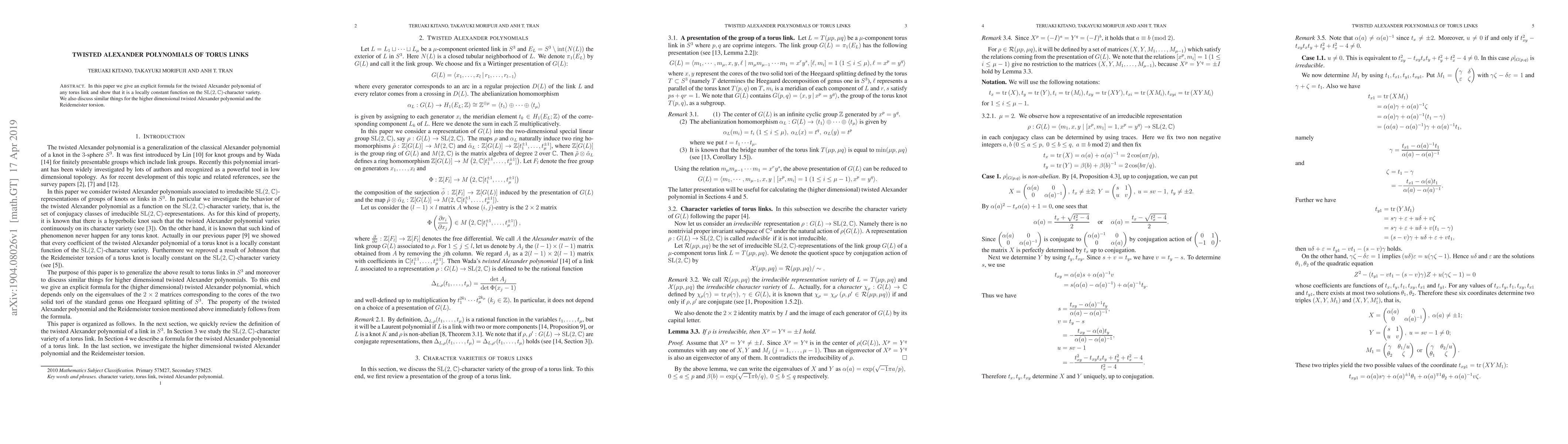 Summary: This paper provides an explicit formula for the twisted Alexander polynomial of torus links and demonstrates its local constancy on the $SL(2, \mathbb{C})$-character variety. It also extends these findings to higher-dimensional analogues and the Reidemeister torsion.