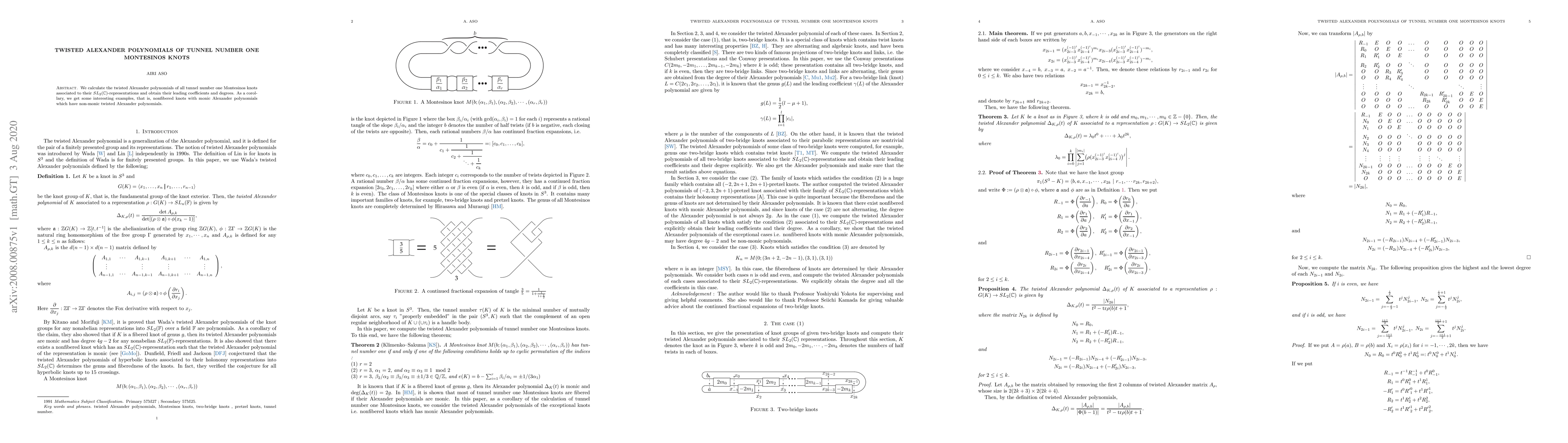 Summary: The paper calculates twisted Alexander polynomials for tunnel number one Montesinos knots, revealing leading coefficients and degrees, and highlights nonfibered knots with monic Alexander but non-monic twisted Alexander polynomials.