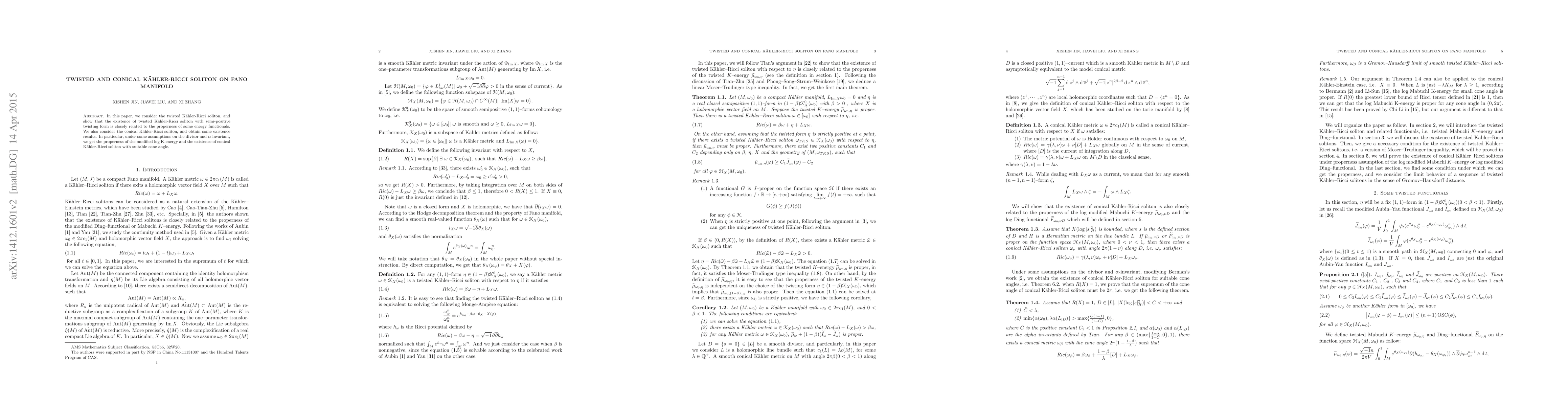 This paper investigates the existence of twisted and conical Kähler-Ricci solitons on Fano manifolds, demonstrating a connection between twisted solitons with semi-positive twisting forms and the properness of certain energy functionals, and obtaining existence results for conical solitons under specific conditions on divisors and α-invariants.