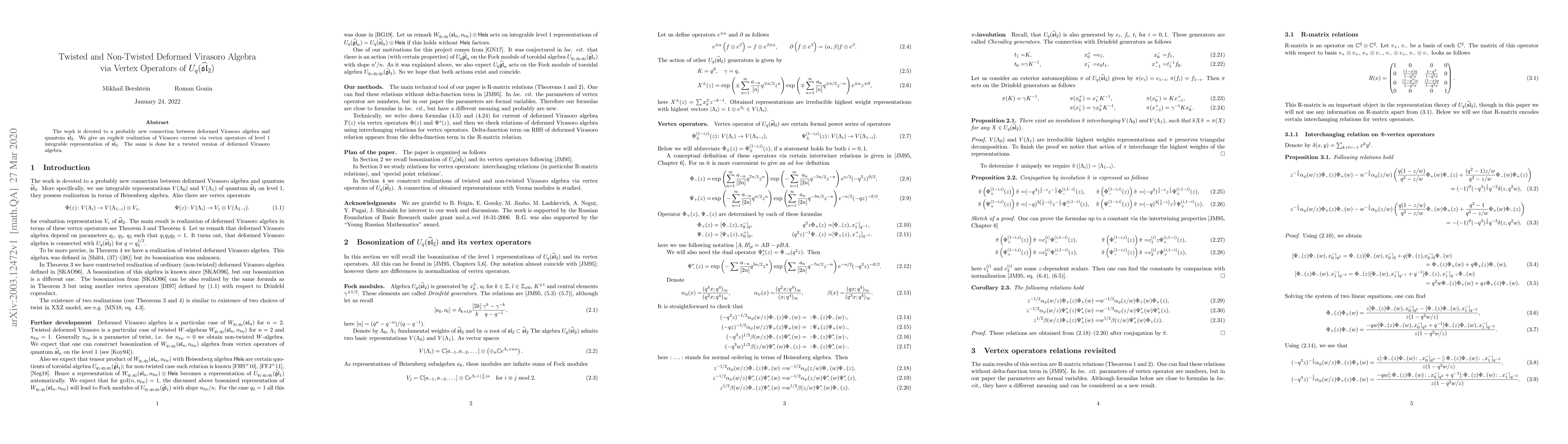 The work is devoted to a probably new connection between deformed Virasoro algebra and quantum $\widehat{\mathfrak{sl}}_2$. We give an explicit realization of Virasoro current via vertex operators of level 1 integrable representation of $\widehat{\mathfrak{sl}}_2$. The same is done for a twisted version of deformed Virasoro algebra.