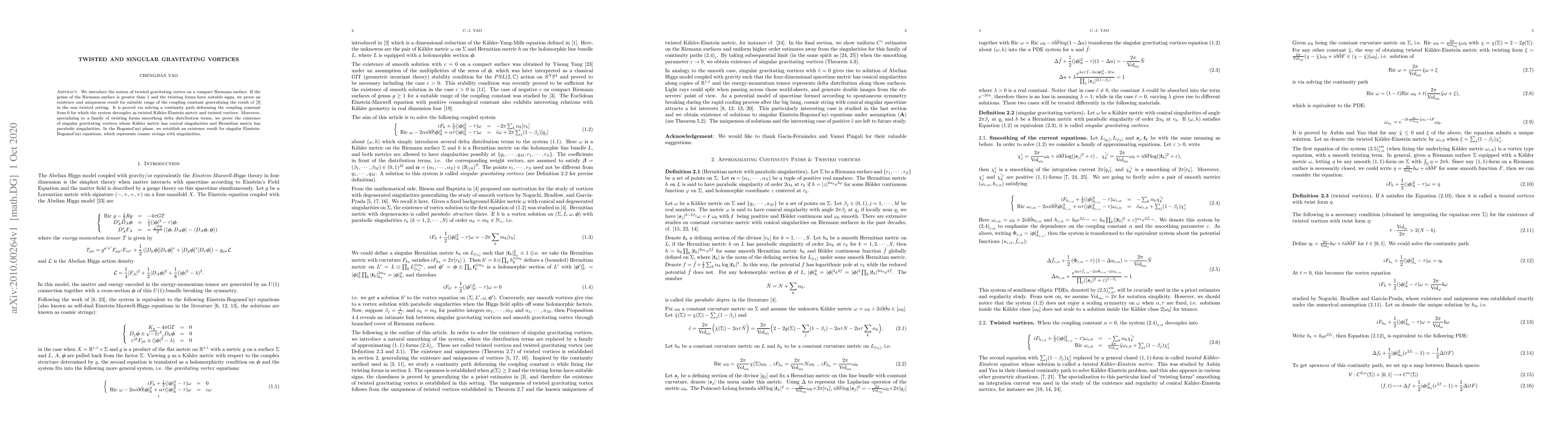 This paper introduces twisted gravitating vortices on compact Riemann surfaces, proving existence and uniqueness for a range of coupling constants on surfaces of genus greater than 1. It also demonstrates the existence of singular gravitating vortices with conical and parabolic singularities, and establishes solutions for singular Einstein-Bogomol'nyi equations representing cosmic strings with singularities.