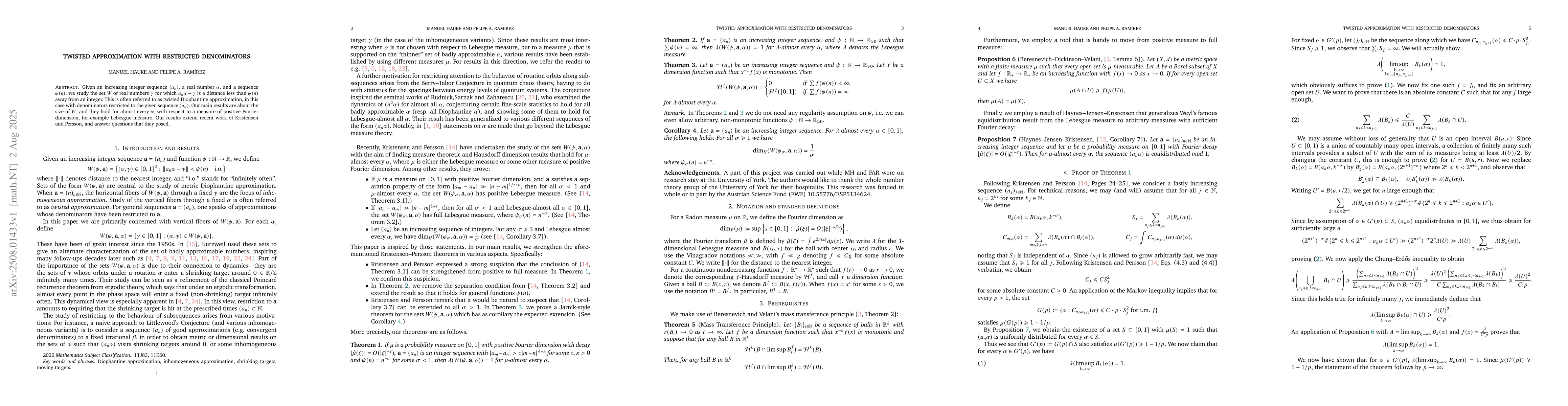 Given an increasing integer sequence $(a_n)$, a real number $\alpha$, and a sequence $\psi(n)$, we study the set $W$ of real numbers $\gamma$ for which $a_n\alpha - \gamma$ is a distance less than $\psi(n)$ away from an integer. This is often referred to as twisted Diophantine approximation, in this case with denominators restricted to the given sequence $(a_n)$. Our main results are about the size of $W$, and they hold for almost every $\alpha$, with respect to a measure of positive Fourier dimension, for example Lebesgue measure. Our results extend recent work of Kristensen and Persson, and answer questions that they posed.