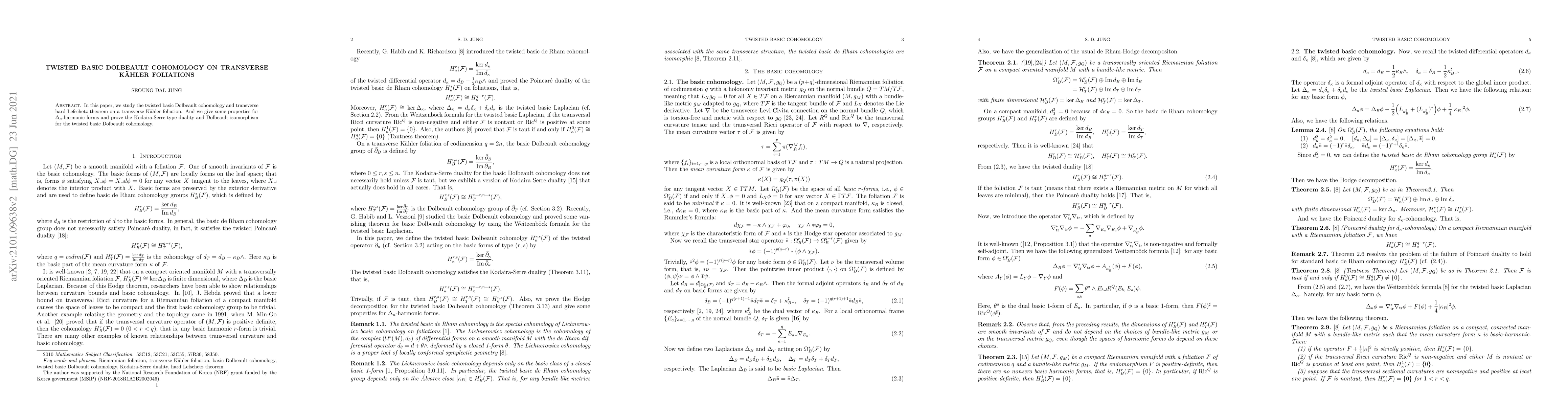 In this paper, we study the twisted basic Dolbeault cohomology and transverse hard Lefschetz theorem on a transverse Kahler foliation. And we give some properties for $\Delta_\kappa$-harmonic forms and prove the Kodaira-Serre type duality for the twisted basic Dolbeault cohomology.