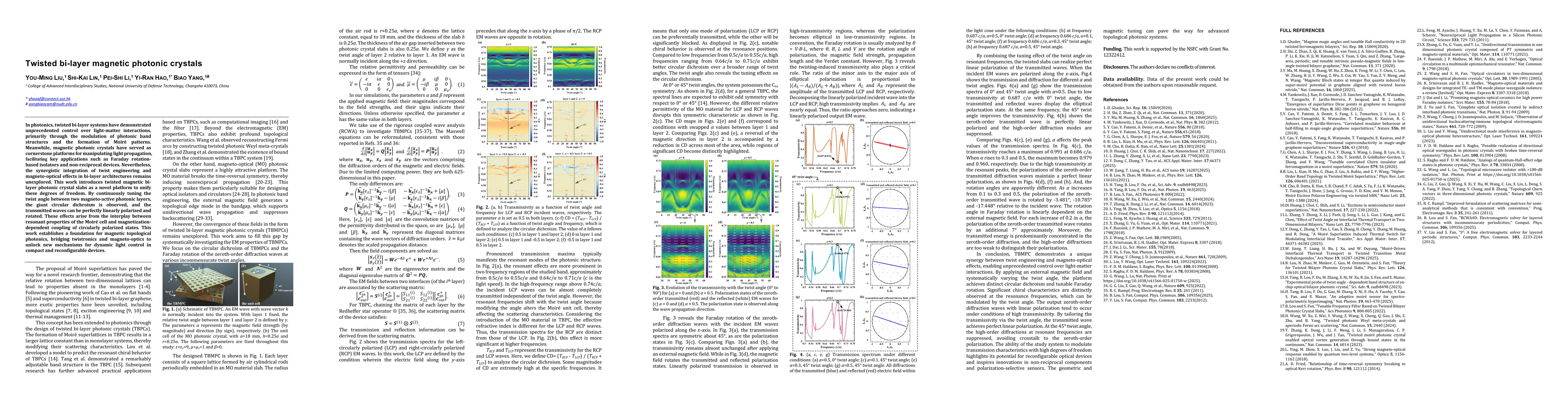 The study employs twisted magnetic bi-layer photonic crystal slabs, utilizing rigorous coupled wave analysis (RCWA) to investigate the interaction between twist engineering and magneto-optical effects. The researchers analyze transmission spectra and polarization states of electromagnetic waves under varying twist angles and magnetic fields.