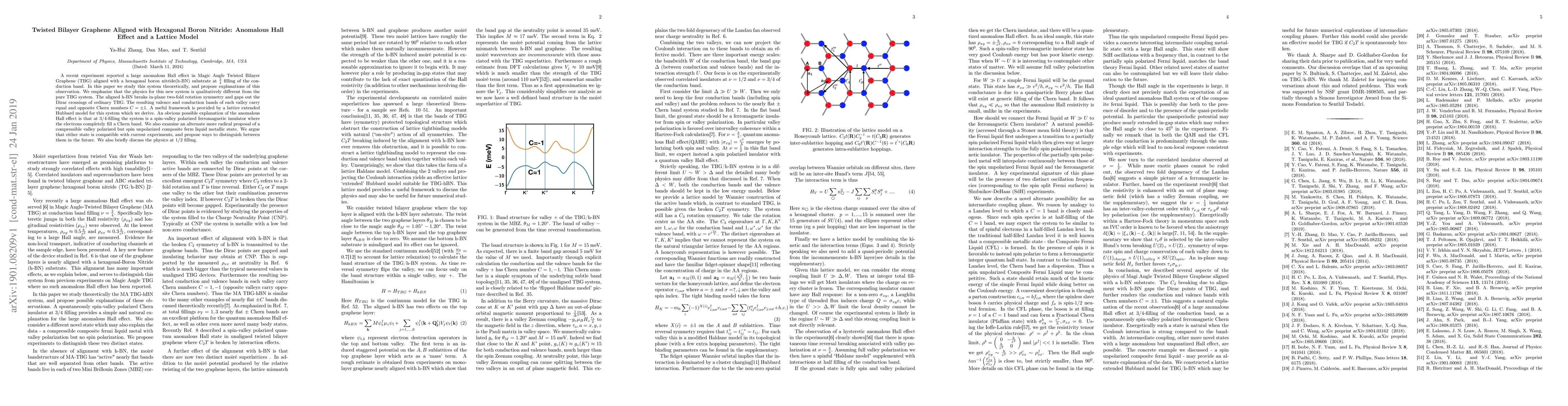 A recent experiment reported a large anomalous Hall effect in Magic Angle Twisted Bilayer Graphene (TBG) aligned with a hexagonal boron nitride(h-BN) substrate at $\frac{3}{4}$ filling of the conduction band. In this paper we study this system theoretically, and propose explanations of this observation. We emphasize that the physics for this new system is qualitatively different from the pure TBG system. The aligned h-BN breaks in-plane two-fold rotation symmetry and gaps out the Dirac crossings of ordinary TBG. The resulting valence and conduction bands of each valley carry equal and opposite Chern numbers $C=\pm 1$. A useful framework is provided by a lattice extended Hubbard model for this system which we derive. An obvious possible explanation of the anomalous Hall effect is that at $3/4$-filling the system is a spin-valley polarized ferromagnetic insulator where the electrons completely fill a Chern band. We also examine an alternate more radical proposal of a compressible valley polarized but spin unpolarized composite ferm liquid metallic state. We argue that either state is compatible with current experiments, and propose ways to distinguish between them in the future. We also briefly discuss the physics at $1/2$ filling.