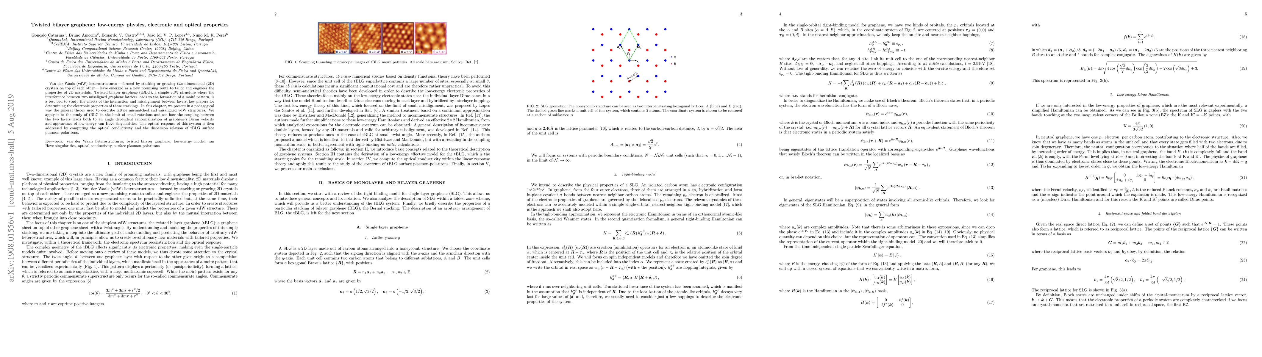 Van der Waals (vdW) heterostructures ---formed by stacking or growing two-dimensional (2D) crystals on top of each other--- have emerged as a new promising route to tailor and engineer the properties of 2D materials. Twisted bilayer graphene (tBLG), a simple vdW structure where the interference between two misaligned graphene lattices leads to the formation of a moir\'e pattern, is a test bed to study the effects of the interaction and misalignment between layers, key players for determining the electronic properties of these stackings. In this chapter, we present in a pedagogical way the general theory used to describe lattice mismatched and misaligned vdW structures. We apply it to the study of tBLG in the limit of small rotations and see how the coupling between the two layers leads both to an angle dependent renormalization of graphene's Fermi velocity and appearance of low-energy van Hove singularities. The optical response of this system is then addressed by computing the optical conductivity and the dispersion relation of tBLG surface plasmon-polaritons.
