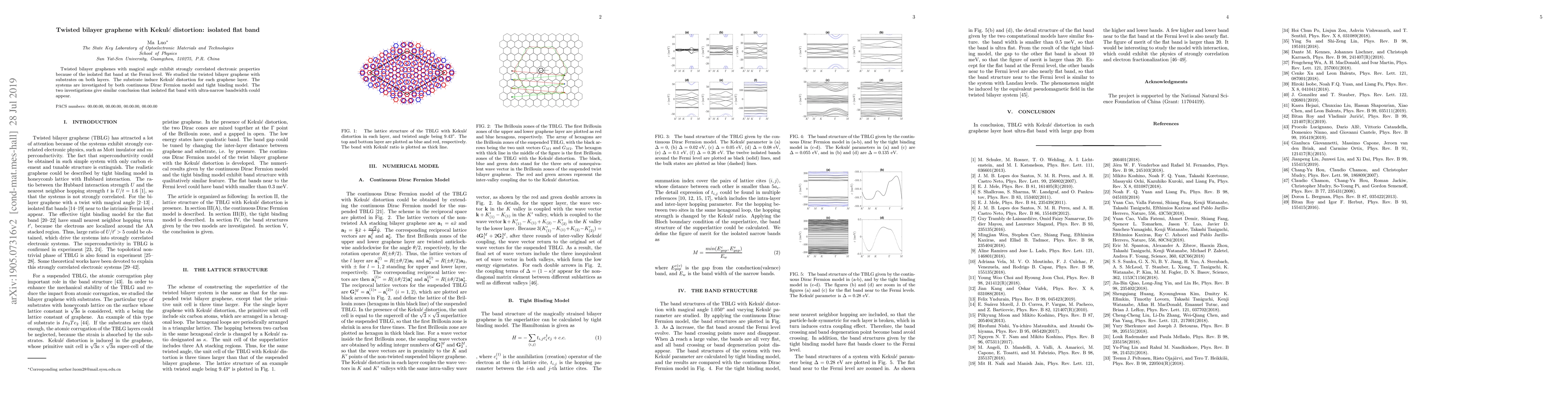 Twisted bilayer graphene with Kekule distortion shows an isolated flat band at the Fermi level due to substrate-induced effects. Both continuous Dirac Fermion and tight-binding models confirm the appearance of this ultra-narrow bandwidth band, highlighting strongly correlated electronic properties.