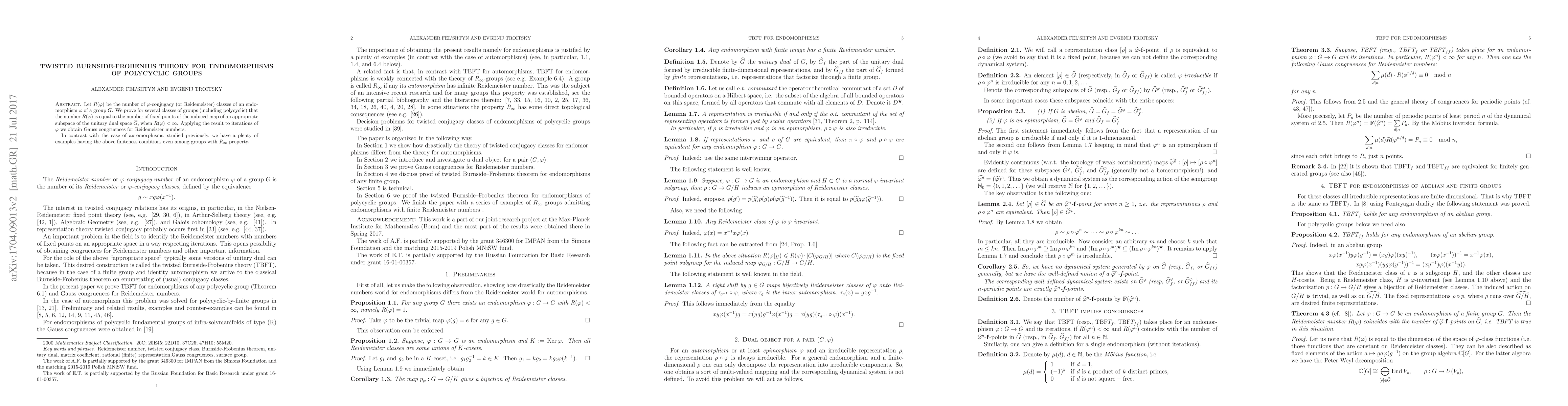 Let $R(\phi)$ be the number of $\phi$-conjugacy (or Reidemeister) classes of an endomorphism $\phi$ of a group $G$. We prove for several classes of groups (including polycyclic) that the number $R(\phi)$ is equal to the number of fixed points of the induced map of an appropriate subspace of the unitary dual space $\widehat G$, when $R(\phi)<\infty$. Applying the result to iterations of $\phi$ we obtain Gauss congruences for Reidemeister numbers. In contrast with the case of automorphisms, studied previously, we have a plenty of examples having the above finiteness condition, even among groups with $R_\infty$ property.