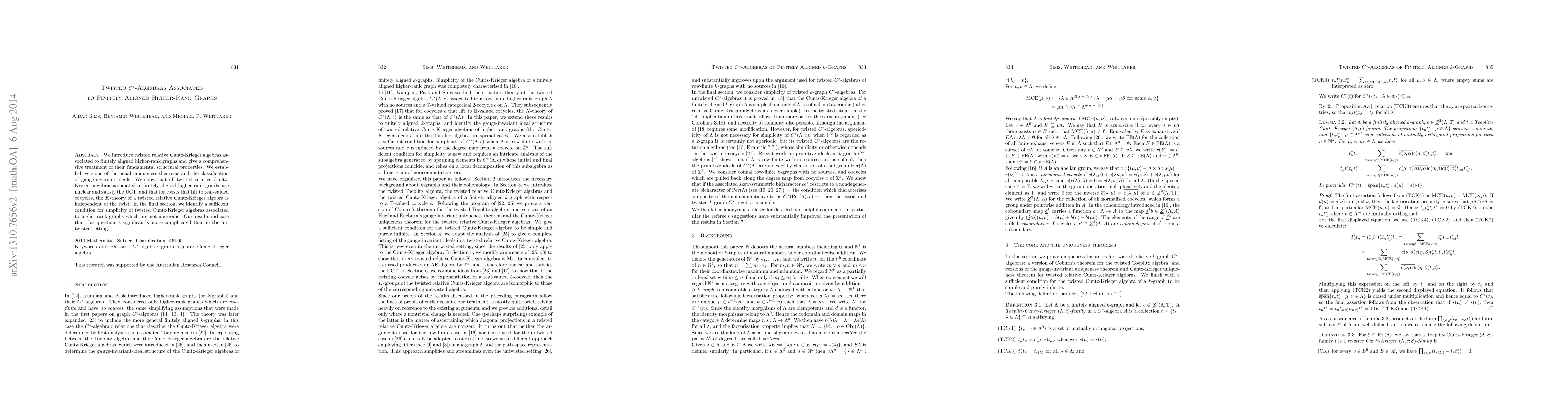 This paper introduces twisted relative Cuntz-Krieger algebras for finitely aligned higher-rank graphs, proving their nuclearity, UCT satisfaction, and classification of gauge-invariant ideals. It also identifies conditions for simplicity, showing the complexity of the problem compared to the untwisted case.