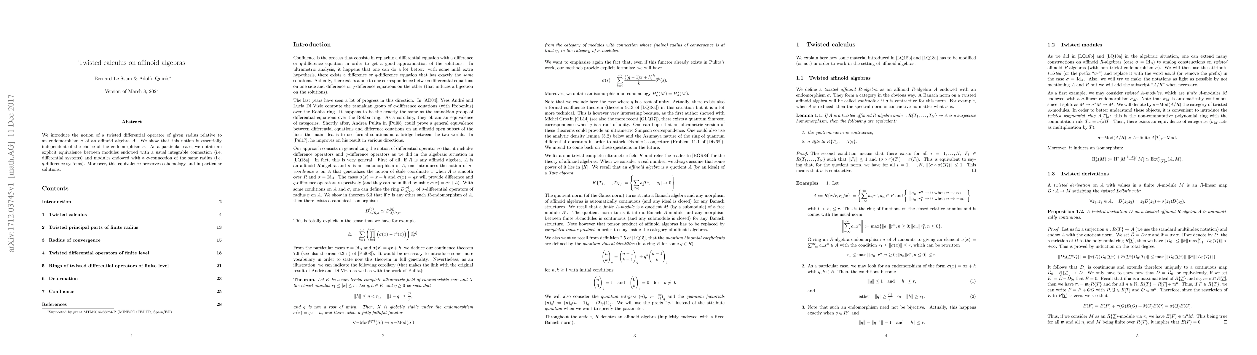 This paper introduces twisted differential operators on affinoid algebras relative to an endomorphism $$\sigma$$, demonstrating their independence from $$\sigma$$. It establishes an equivalence between modules with integrable connections and those with $$\sigma$$-connections, preserving cohomology and solutions.