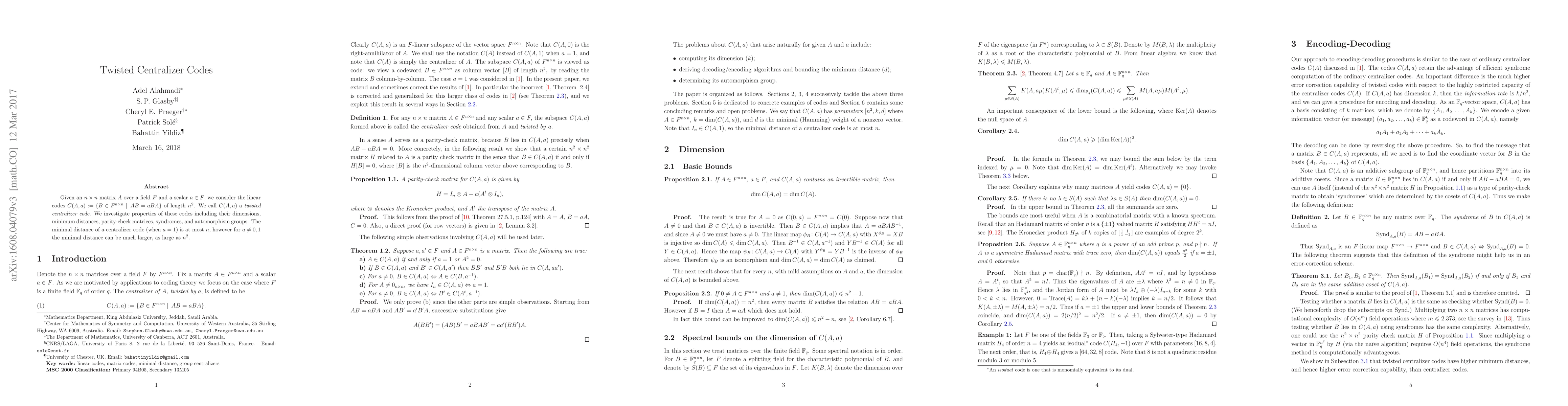 Given an $n\times n$ matrix $A$ over a field $F$ and a scalar $a\in F$, we consider the linear codes $C(A,a):=\{B\in F^{n\times n}\mid \,AB=aBA\}$ of length $n^2$. We call $C(A,a)$ a twisted centralizer code. We investigate properties of these codes including their dimensions, minimum distances, parity-check matrices, syndromes, and automorphism groups. The minimal distance of a centralizer code (when $a=1$) is at most $n$, however for $a\ne 0,1$ the minimal distance can be much larger, as large as $n^2$.