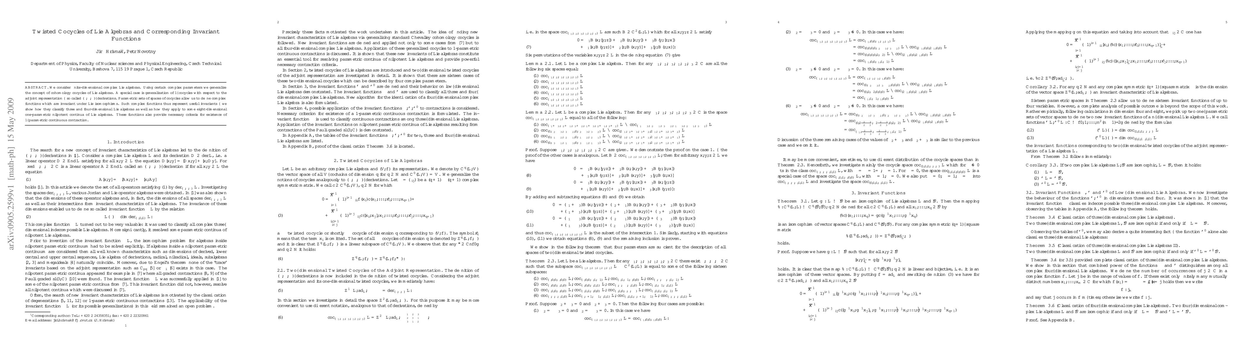 We consider finite-dimensional complex Lie algebras. Using certain complex parameters we generalize the concept of cohomology cocycles of Lie algebras. A special case is generalization of 1-cocycles with respect to the adjoint representation - so called $(\alpha,\beta,\gamma)$--derivations. Parametric sets of spaces of cocycles allow us to define complex functions which are invariant under Lie isomorphisms. Such complex functions thus represent useful invariants - we show how they classify three and four-dimensional Lie algebras as well as how they apply to some eight-dimensional one-parametric nilpotent continua of Lie algebras. These functions also provide necessary criteria for existence of 1-parametric continuous contraction.