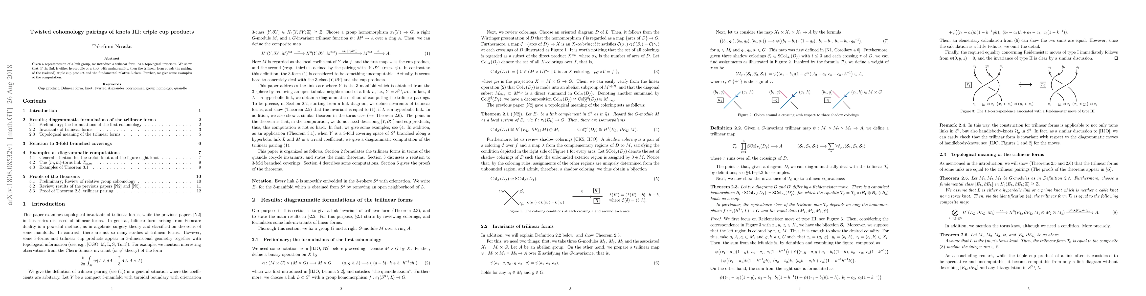 Given a representation of a link group, we introduce a trilinear form, as a topological invariant. We show that, if the link is either hyperbolic or a knot with malnormality, then the trilinear form equals the pairing of the (twisted) triple cup product and the fundamental relative 3-class. Further, we give some examples of the computation.