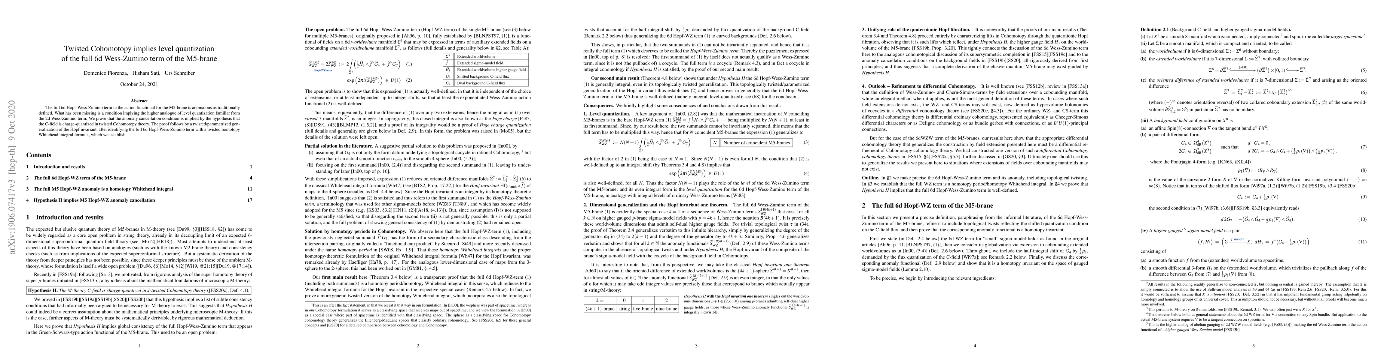 Summary: The paper proves that the anomaly in the full 6d Hopf-Wess-Zumino term for the M5-brane is canceled by requiring charge quantization of the C-field in twisted Cohomotopy theory, establishing a higher-dimensional analogue of level quantization. This is achieved through a generalized Hopf invariant and a new twisted homotopy Whitehead integral formula.