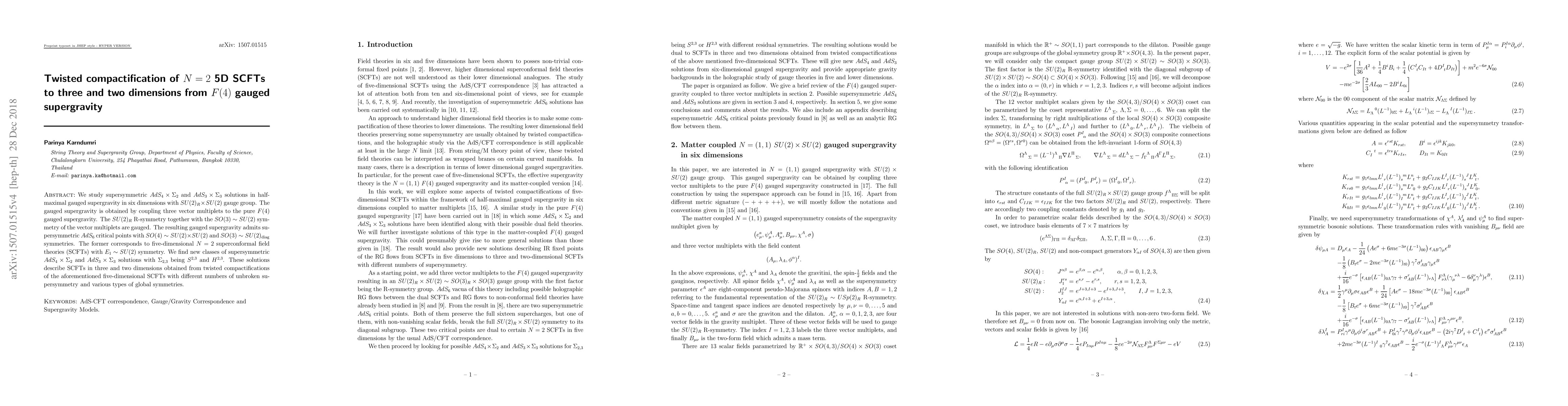 We study supersymmetric $AdS_4\times \Sigma_2$ and $AdS_3\times \Sigma_3$ solutions in half-maximal gauged supergravity in six dimensions with $SU(2)_R\times SU(2)$ gauge group. The gauged supergravity is obtained by coupling three vector multiplets to the pure $F(4)$ gauged supergravity. The $SU(2)_R$ R-symmetry together with the $SO(3)\sim SU(2)$ symmetry of the vector multiplets are gauged. The resulting gauged supergravity admits supersymmetric $AdS_6$ critical points with $SO(4)\sim SU(2)\times SU(2)$ and $SO(3)\sim SU(2)_{\textrm{diag}}$ symmetries. The former corresponds to five-dimensional $N=2$ superconformal field theories (SCFTs) with $E_1\sim SU(2)$ symmetry. We find new classes of supersymmetric $AdS_4\times \Sigma_2$ and $AdS_3\times \Sigma_3$ solutions with $\Sigma_{2,3}$ being $S^{2,3}$ and $H^{2,3}$. These solutions describe SCFTs in three and two dimensions obtained from twisted compactifications of the aforementioned five-dimensional SCFTs with different numbers of unbroken supersymmetry and various types of global symmetries.