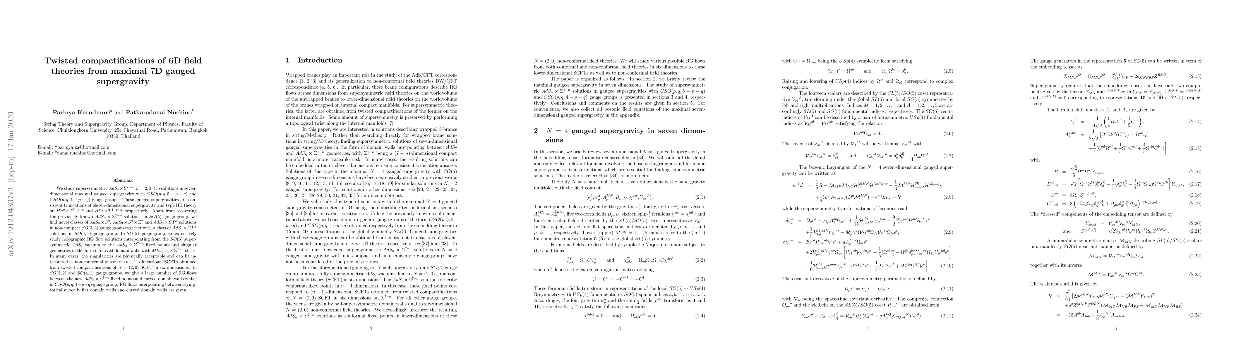 Researchers study supersymmetric compactifications of 6D field theories from maximal 7D gauged supergravity, discovering new solutions and holographic RG flows in various gauge groups.