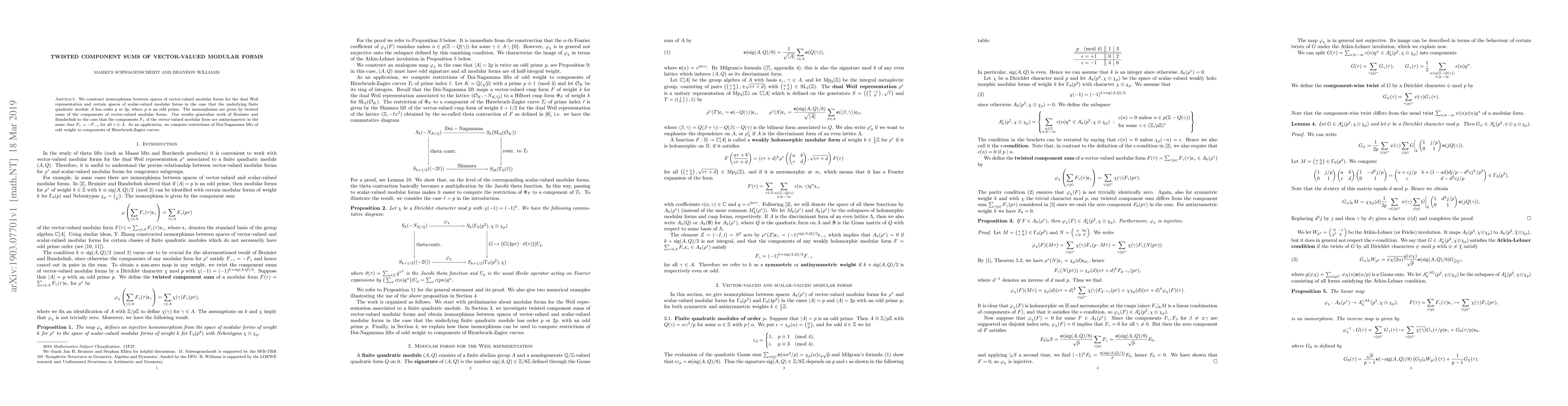 We construct isomorphisms between spaces of vector-valued modular forms for the dual Weil representation and certain spaces of scalar-valued modular forms in the case that the underlying finite quadratic module $A$ has order $p$ or $2p$, where $p$ is an odd prime. The isomorphisms are given by twisted sums of the components of vector-valued modular forms. Our results generalize work of Bruinier and Bundschuh to the case that the components $F_{\gamma}$ of the vector-valued modular form are antisymmetric in the sense that $F_{\gamma} = -F_{-\gamma}$ for all $\gamma \in A$. As an application, we compute restrictions of Doi-Naganuma lifts of odd weight to components of Hirzebruch-Zagier curves.