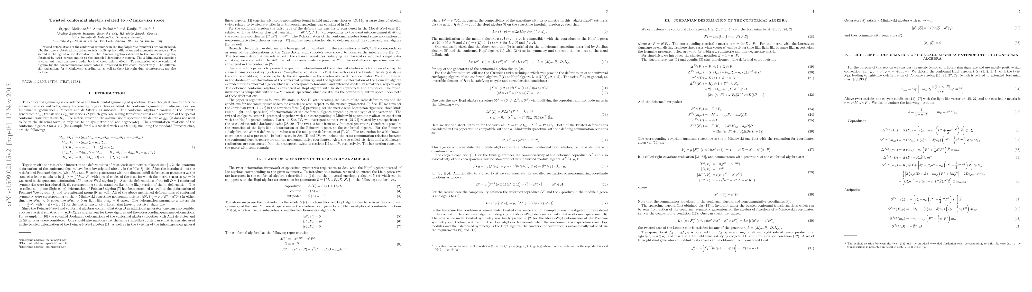 Twisted deformations of the conformal symmetry in the Hopf algebraic framework are constructed. The first one is obtained by a Jordanian twist built up from dilatation and momenta generators. The second is the light-like $\kappa$-deformation of the Poincare algebra extended to the conformal algebra, obtained by a twist corresponding to the extended Jordanian r-matrix. The $\kappa$-Minkowski spacetime is covariant quantum space under both of these deformations. The extension of the conformal algebra by the noncommutative coordinates is presented in two cases. The differential realizations for $\kappa$-Minkowski coordinates, as well as their left-right dual counterparts, are also included.