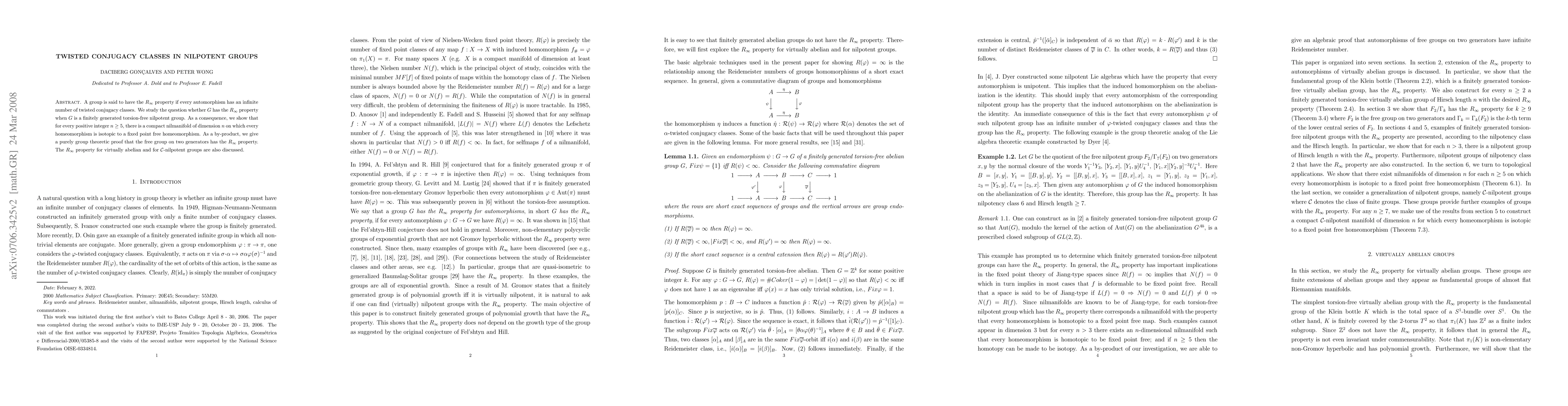 The paper introduces detailed proofs for the $R_\infty$ property in specific classes of nilpotent groups, linking group-theoretic properties to topological dynamics on nilmanifolds.