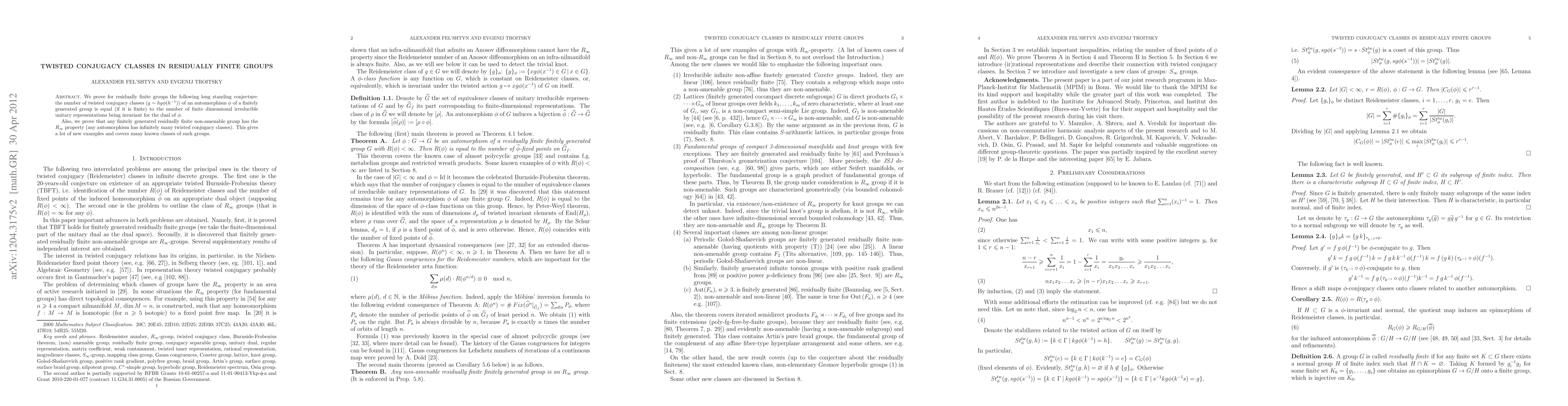 This paper resolves a longstanding conjecture by proving that in residually finite groups, the number of twisted conjugacy classes of an automorphism equals the number of invariant finite-dimensional irreducible unitary representations of its dual. Additionally, it establishes that any finitely generated residually finite non-amenable group has the R-infinity property, meaning it possesses infinitely many twisted conjugacy classes.