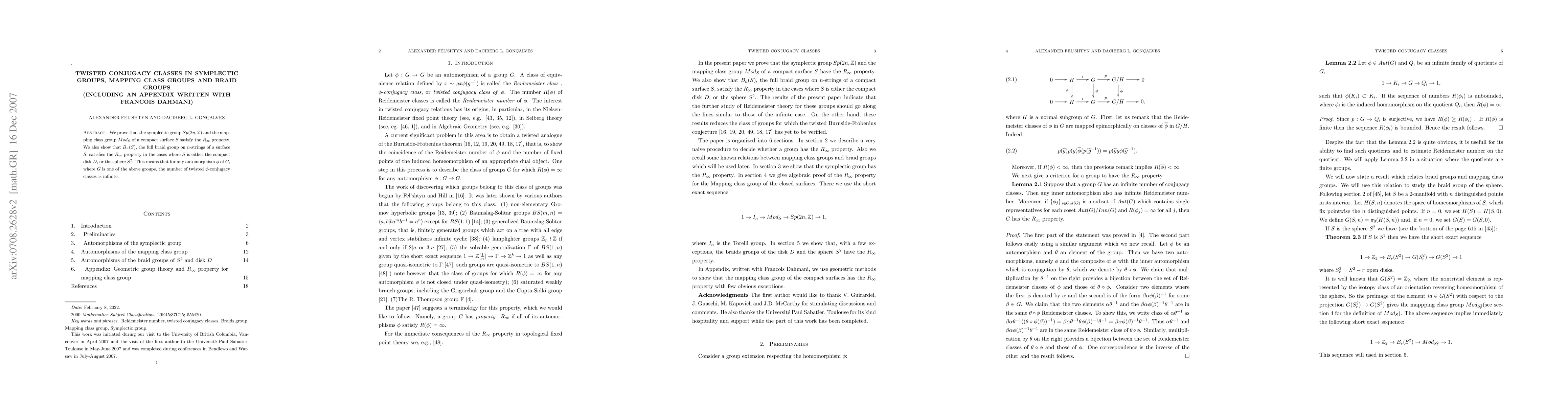 Summary: The paper demonstrates that $Sp(2n,\mathbb Z)$, $Mod_{S}$, and $B_n(S)$ possess the $R_{\infty}$ property, implying infinite twisted conjugacy classes under any automorphism for these groups, particularly when $S$ is a compact disk or sphere.