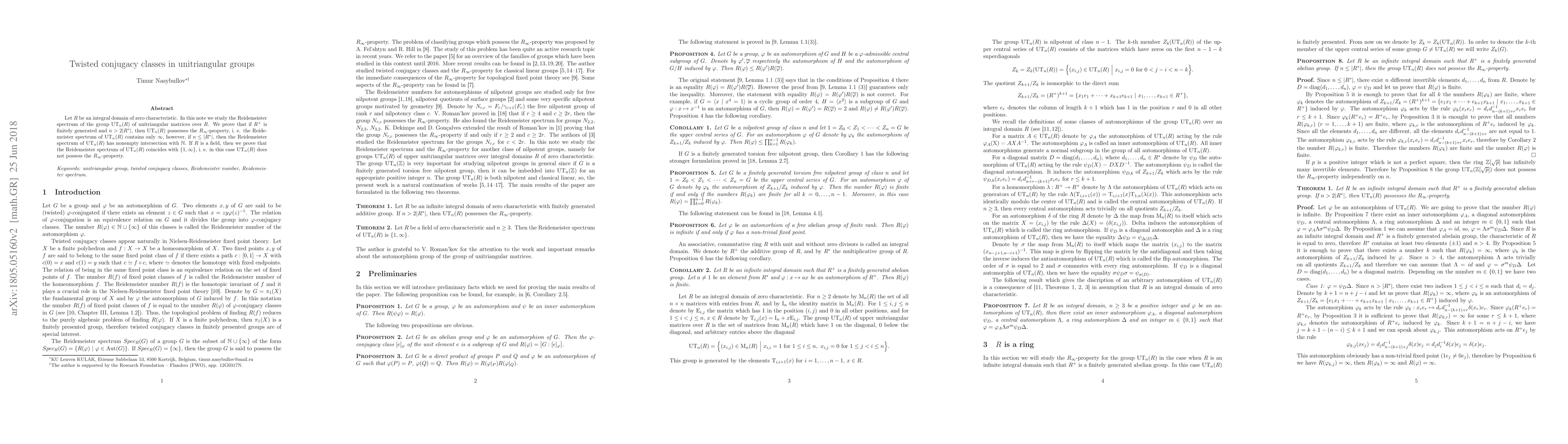 Let $R$ be an integral domain of zero characteristic. In this note we study the Reidemeister spectrum of the group ${\rm UT}_n(R)$ of unitriangular matrices over $R$. We prove that if $R^+$ is finitely generated and $n>2|R^*|$, then ${\rm UT}_n(R)$ possesses the $R_{\infty}$-property, i. e. the Reidemeister spectrum of ${\rm UT}_n(R)$ contains only $\infty$, however, if $n\leq|R^*|$, then the Reidemeister spectrum of ${\rm UT}_n(R)$ has nonempty intersection with $\mathbb{N}$. If $R$ is a field, then we prove that the Reidemeister spectrum of ${\rm UT}_n(R)$ coincides with $\{1,\infty\}$, i. e. in this case ${\rm UT}_n(R)$ does not possess the $R_{\infty}$-property.