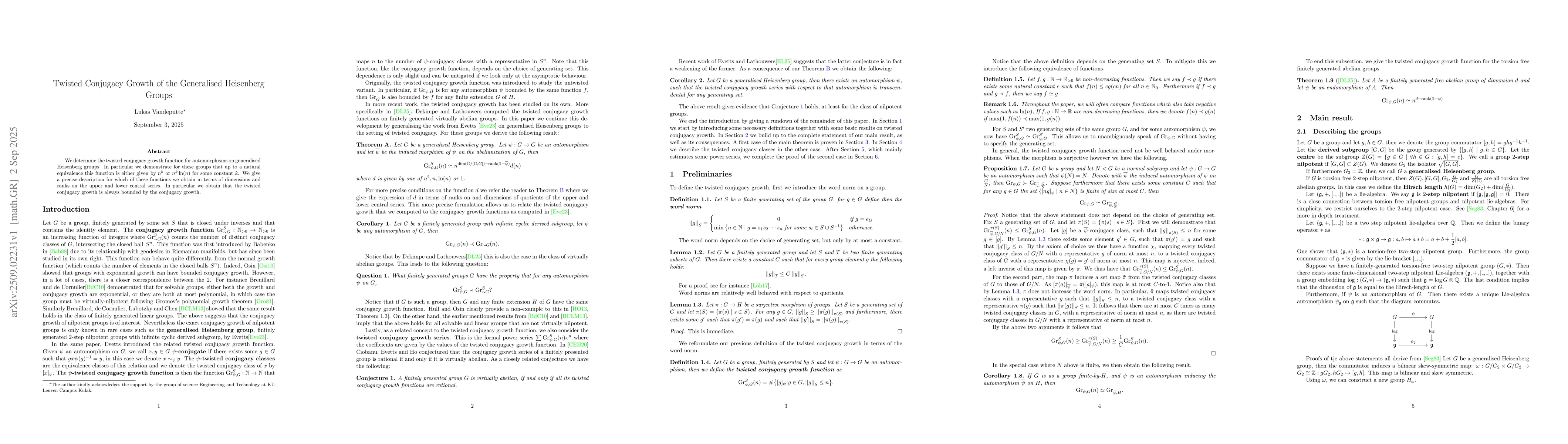 We determine the twisted conjugacy growth function for automorphisms on generalised Heisenberg groups. In particular we demonstrate for these groups that up to a natural equivalence this function is either given by $n^k$ or $n^k\ln(n)$ for some constant $k$. We give a precise description for which of these functions we obtain in terms of dimensions and ranks on the upper and lower central series. In particular we obtain that the twisted conjugacy growth is always bounded by the conjugacy growth.