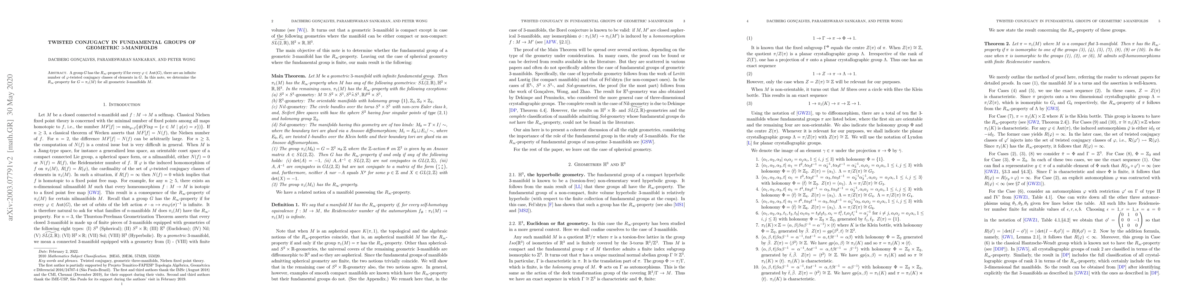 A group $G$ has property $R_\infty$ if for every $\phi\in Aut(G)$, there are an infinite number of $\phi$-twisted conjugacy classes of elements in $G$. In this note, we determine the $R_\infty$-property for $G=\pi_1(M)$ for all geometric $3$-manifolds $M$.