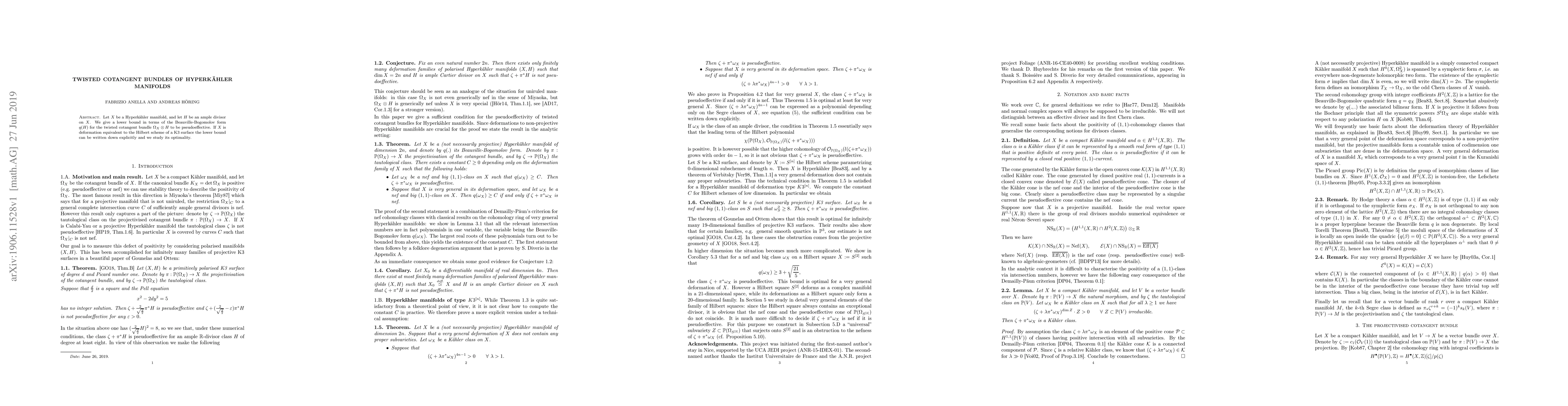 This paper provides a lower bound for the pseudoeffectiveness of the twisted cotangent bundle $\Omega_X \otimes H$ on Hyperkähler manifolds $X$, expressed in terms of the Beauville-Bogomov form $q(H)$. It explicitly investigates the bound's optimality when $X$ deformation-equivalent to the Hilbert scheme of a K3 surface.