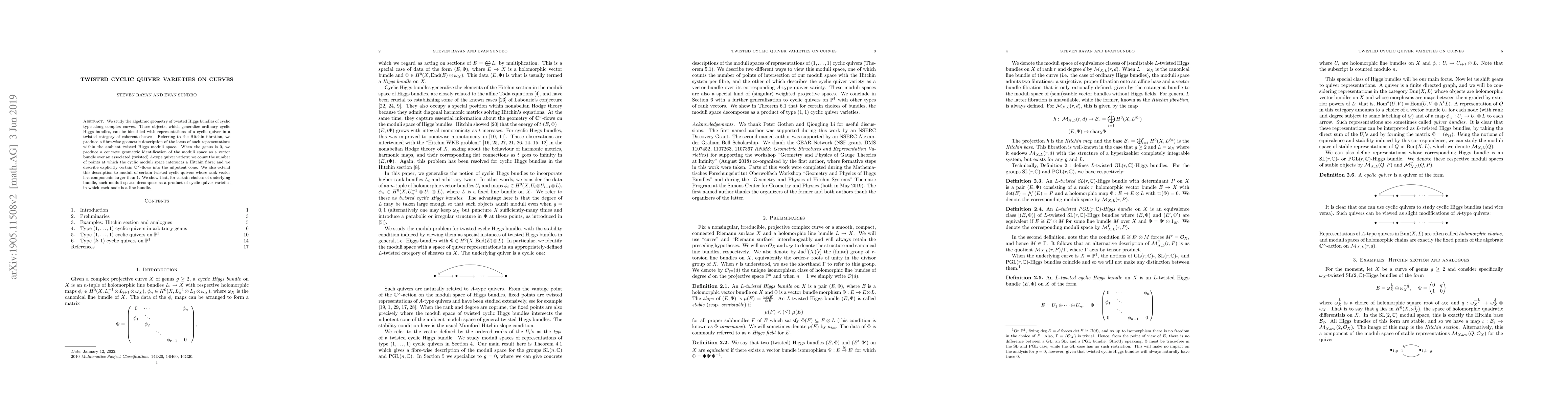 We study the algebraic geometry of twisted Higgs bundles of cyclic type along complex curves. These objects, which generalize ordinary cyclic Higgs bundles, can be identified with representations of a cyclic quiver in a twisted category of coherent sheaves. Referring to the Hitchin fibration, we produce a fibre-wise geometric description of the locus of such representations within the ambient twisted Higgs moduli space. When the genus is 0, we produce a concrete geometric identification of the moduli space as a vector bundle over an associated (twisted) A-type quiver variety; we count the number of points at which the cyclic moduli space intersects a Hitchin fibre; and we describe explicitly certain $\mathbb{C}^\times$-flows into the nilpotent cone. We also extend this description to moduli of certain twisted cyclic quivers whose rank vector has components larger than 1. We show that, for certain choices of underlying bundle, such moduli spaces decompose as a product of cyclic quiver varieties in which each node is a line bundle.