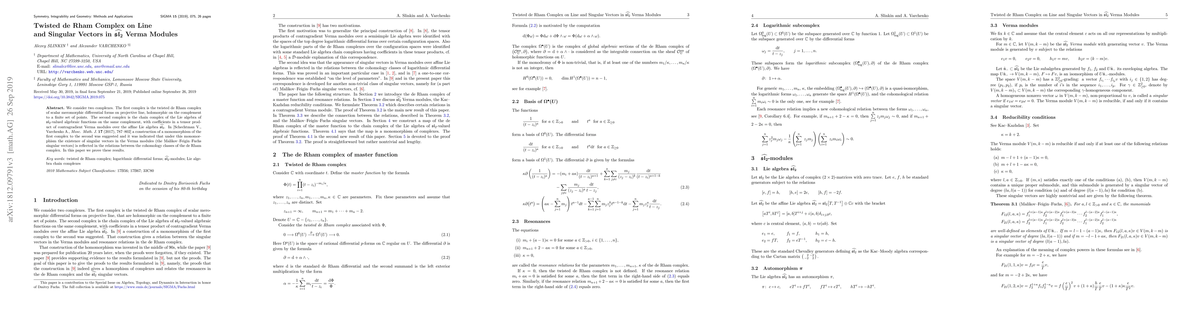 This paper proves the suggested monomorphism between the twisted de Rham complex of meromorphic differential forms on the projective line and the chain complex of $\mathfrak{sl}_2$-valued algebraic functions, demonstrating that the existence of singular vectors in $\hat{{\mathfrak{sl}_2}}$ Verma modules corresponds to relations in the cohomologies of the former.