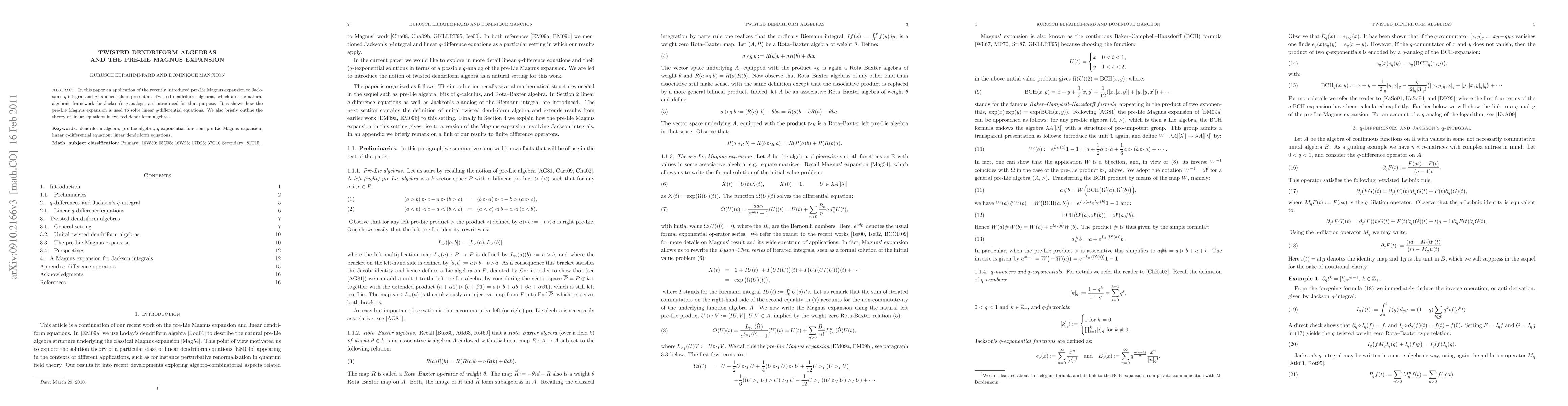 The paper explores the application of the pre-Lie Magnus expansion to Jackson's q-integral and q-exponentials, introducing twisted dendriform algebras as the suitable algebraic framework. The pre-Lie Magnus expansion is utilized to solve linear q-differential equations, with a brief overview of the theory of linear equations in twisted dendriform algebras.