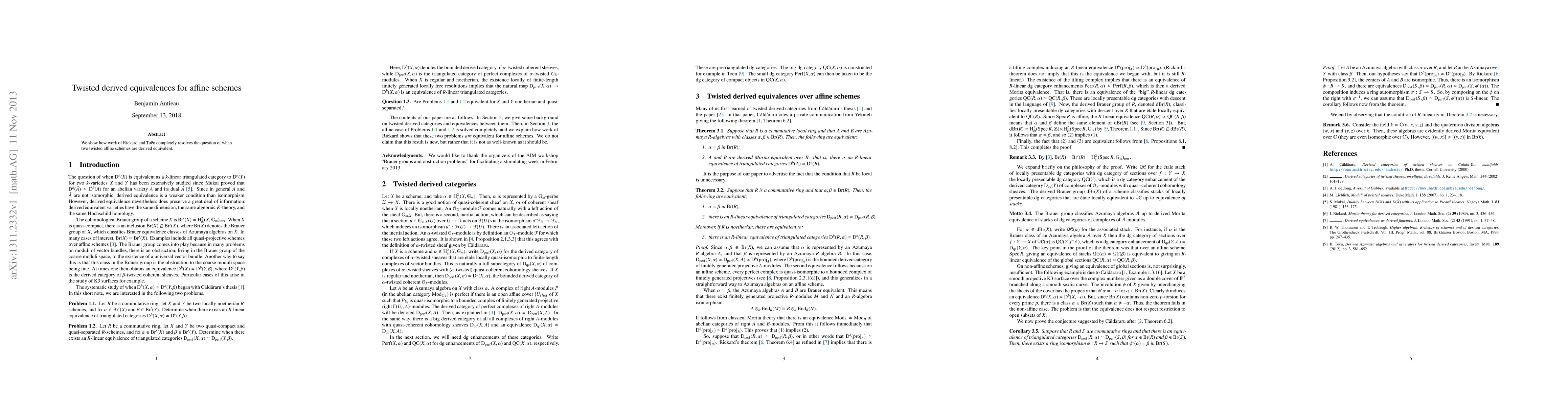 Summary: This paper demonstrates that Rickard and Toën's work provides a complete resolution to determining when two twisted affine schemes are derived equivalent, utilizing advanced techniques in algebraic geometry.