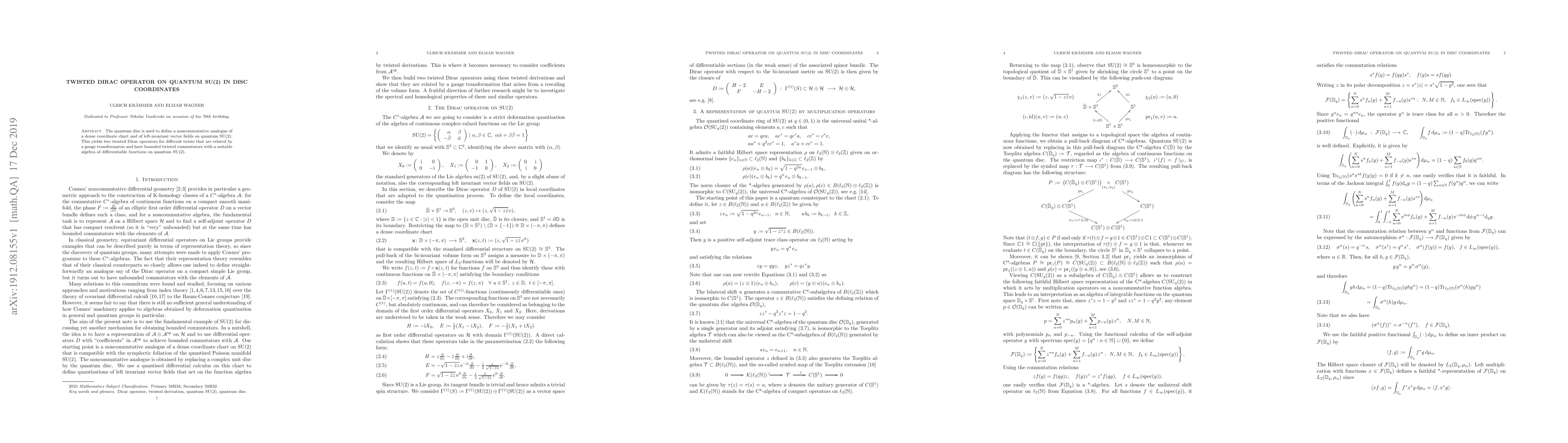 The quantum disc is used to define a noncommutative analogue of a dense coordinate chart and of left-invariant vector fields on quantum SU(2). This yields two twisted Dirac operators for different twists that are related by a gauge transformation and have bounded twisted commutators with a suitable algebra of differentiable functions on quantum SU(2).