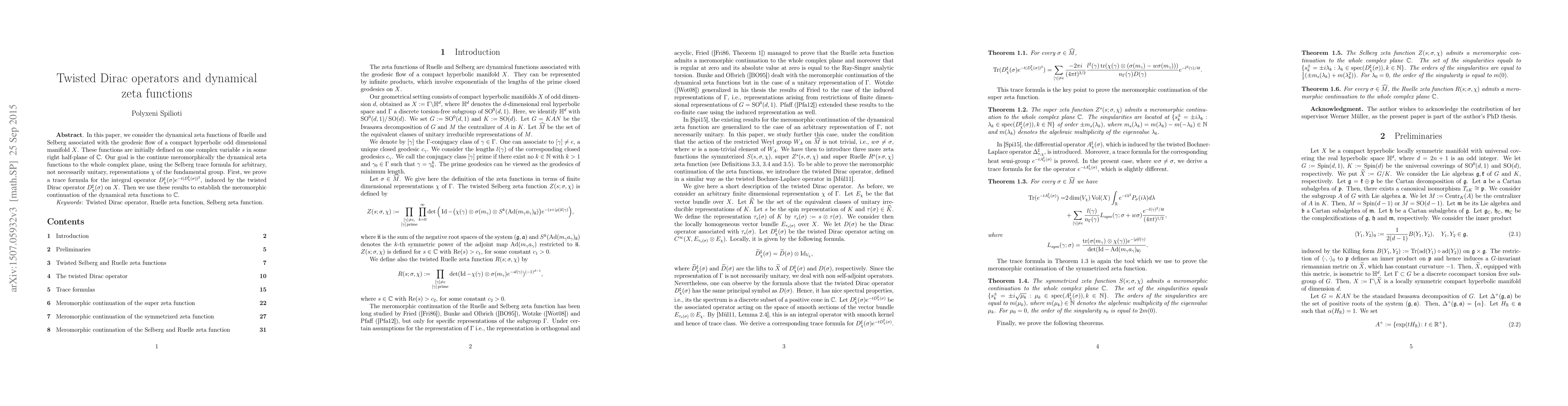 This paper explores the dynamical zeta functions linked to the geodesic flow on a compact hyperbolic odd-dimensional manifold, aiming to extend these functions meromorphically across the complex plane. The authors achieve this by proving a trace formula for the twisted Dirac operator and leveraging the Selberg trace formula.