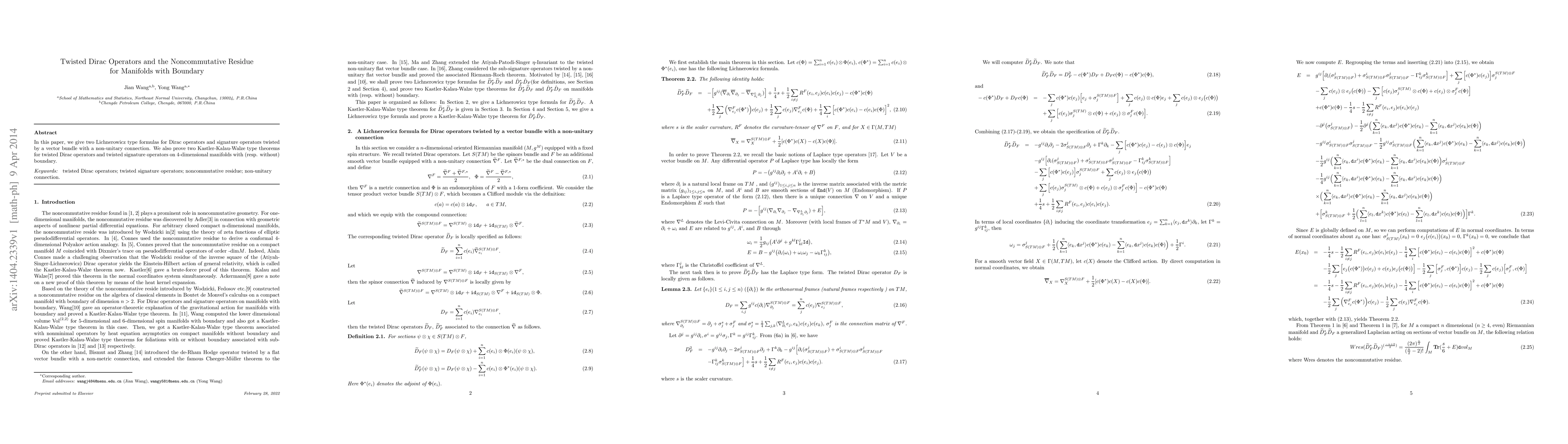 In this paper, we give two Lichnerowicz type formulas for Dirac operators and signature operators twisted by a vector bundle with a non-unitary connection. We also prove two Kastler-Kalau-Walze type theorems for twisted Dirac operators and twisted signature operators on 4-dimensional manifolds with (resp. without) boundary.